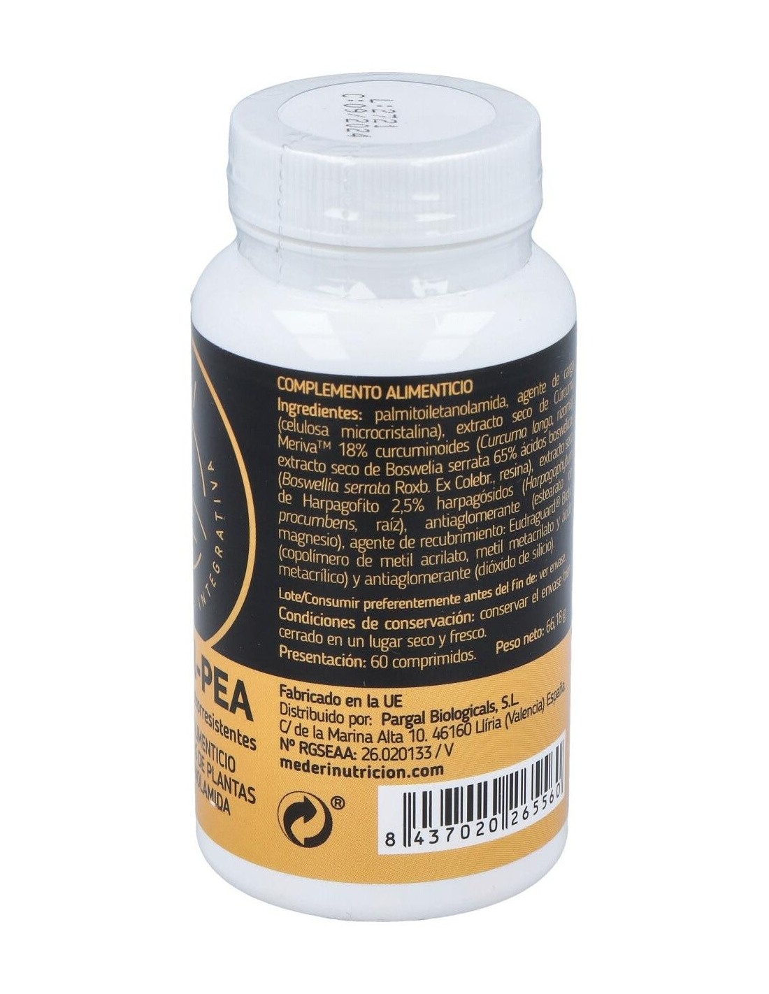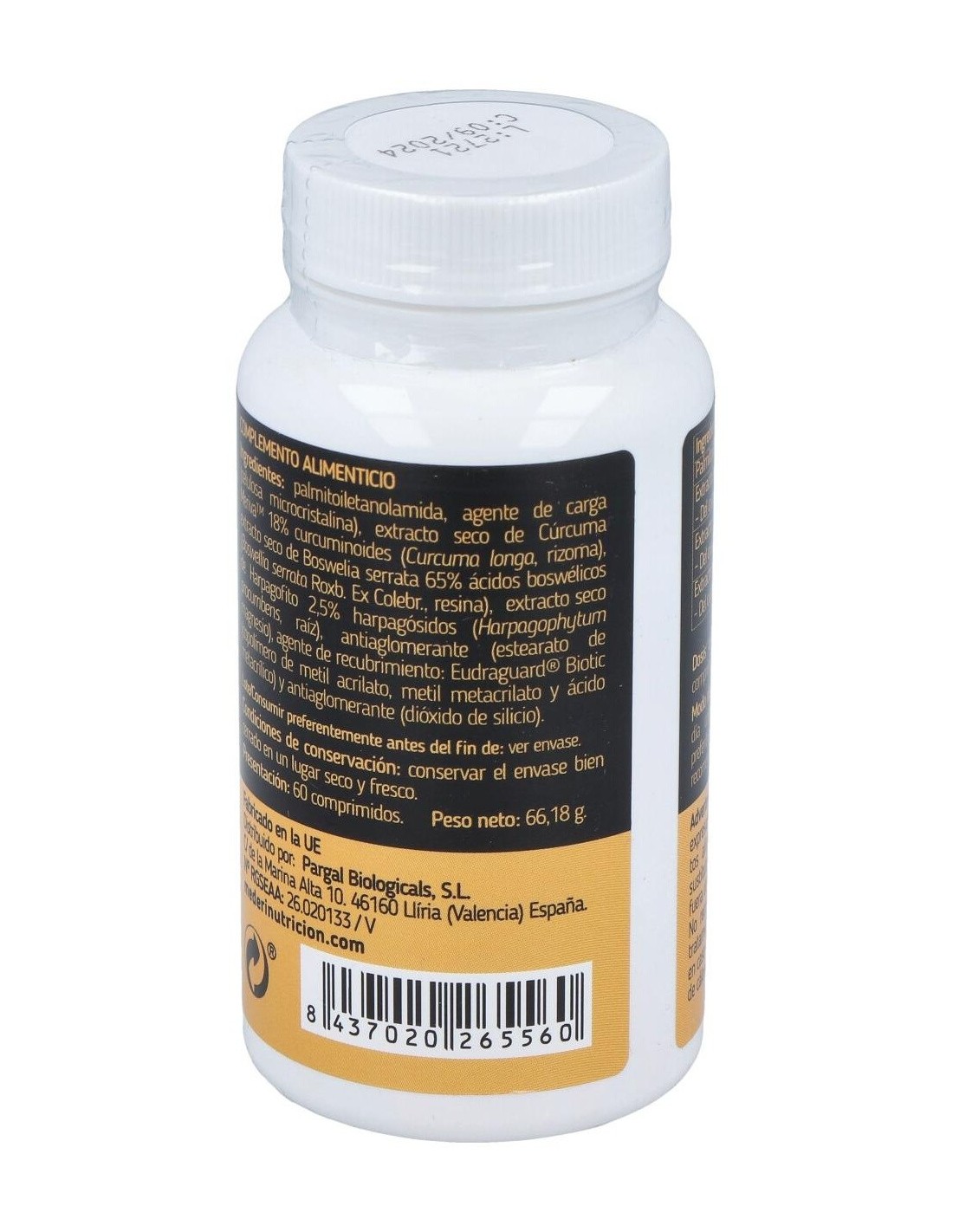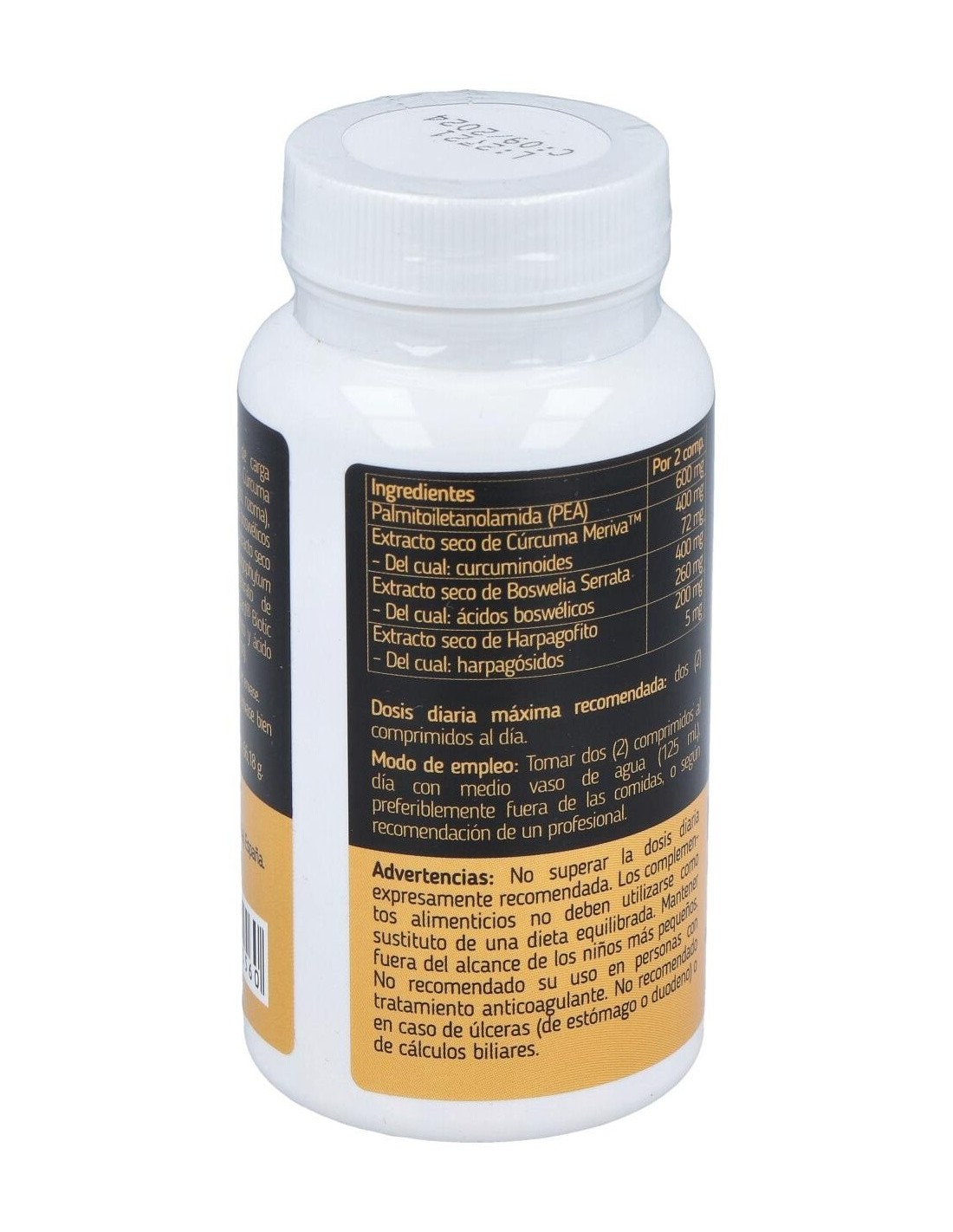 Palmitoiletanolamida, agente de carga (celulosa microcristalina), extracto seco de Cúrcuma Meriva 18% curcuminoides (Curcuma longa, rizoma), extracto seco de Boswelia serrata 65% ácidos boswélicos (Boswellia serrata Roxb. Ex Colebr., resina), extracto seco de Harpagofito 2,5% harpagósidos (Harpagophytum procumbens, raíz), antiaglomerante (estearato de magnesio), agente de recubrimiento: Eudraguard® Biotic (copolímero de metil acrilato, metil metacrilato y ácido metacrílico) y antiaglomerante (dióxido de silicio).