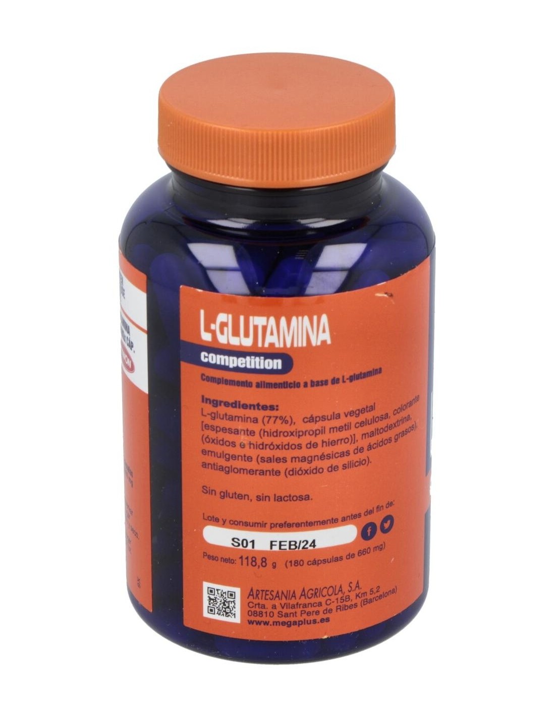 L-glutamina (77%), cápsula vegetal [espesante (hidroxipropil metil celulosa, colorante (óxidos e hidróxidos de hierro)], maltodextrina, emulgente (sales magnésicas de ácidos grasos), antiaglomerante (dióxido de silicio). Sin aspartamo. Sin gluten.