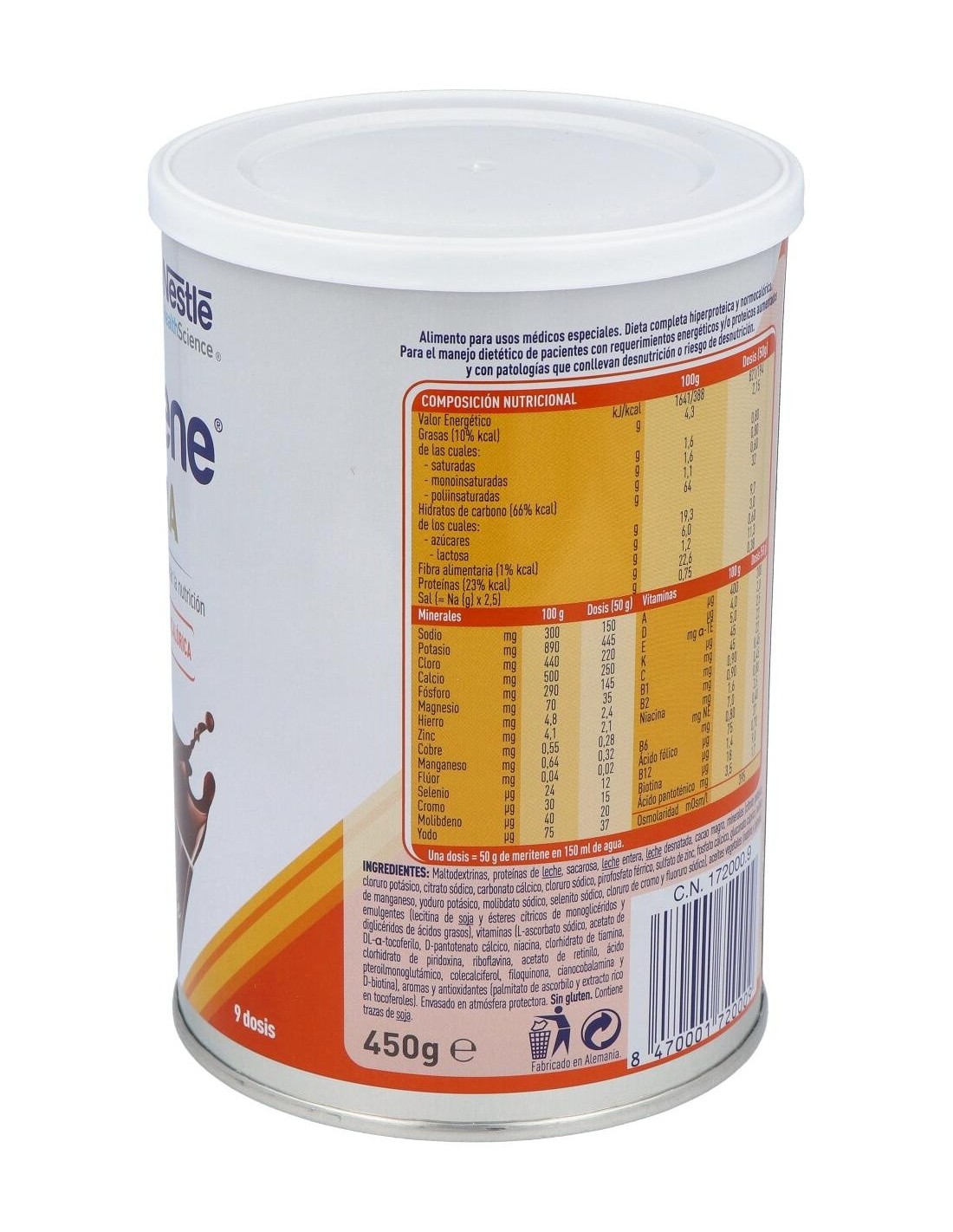 Maltodextrinas, proteínas de leche, sacarosa, leche entera, leche desnatada, cacao magro, minerales (citrato potásico, cloruro potásico, citrato sódico, carbonato cálcico, cloruro sódico, pirofosfato férrico, sulfato de zinc, fosfato cálcico, gluconato cúprico, sulfato de manganeso, yoduro potásico, molibdato sódico, selenito sódico, cloruro de cromo y fluoruro sódico), aceites vegetales (nabina y girasol), emulgentes (lecitina de soja y ésteres cítricos de monoglicéridos y diglicéridos de ácidos grasos), vitaminas (L-ascorbato sódico, acetato de DL-alfa- tocoferilo, D pantotenato cálcico, niacina, clorhidrato de tiamina, clorhidrato de piridoxina, riboflavina, acetao de retinilo, ácido pteroilmonoglutámico, colecalciferol, filoquinona, cianocobalamina y D-biotina), aromas y antioxidantes (palmitato de ascobilo y extracto rico en tocoferoles).