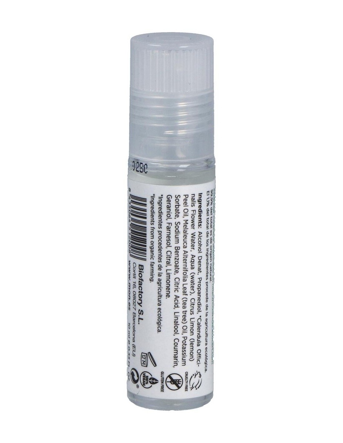 Roll-on antiacné con extracto del árbol del té de la marca Mon Deconatur, Producto basado en propiedades aroma-terapéuticas de los aceites esenciales de árbol del té y de limón. El producto contribuye a la limpieza de la dermis y a la reducción de la proliferación de acné sobre la tez. Composición sin colorantes ni conservantes. Los principios activos más destacados son la caléndula, el limón y el árbol de té.