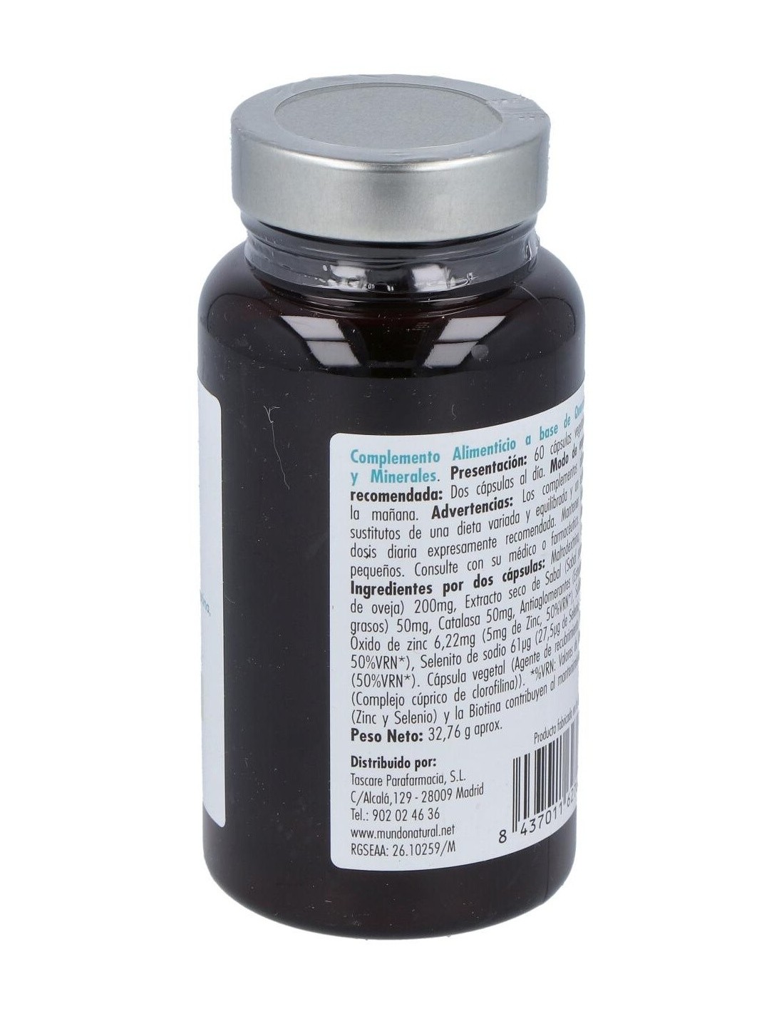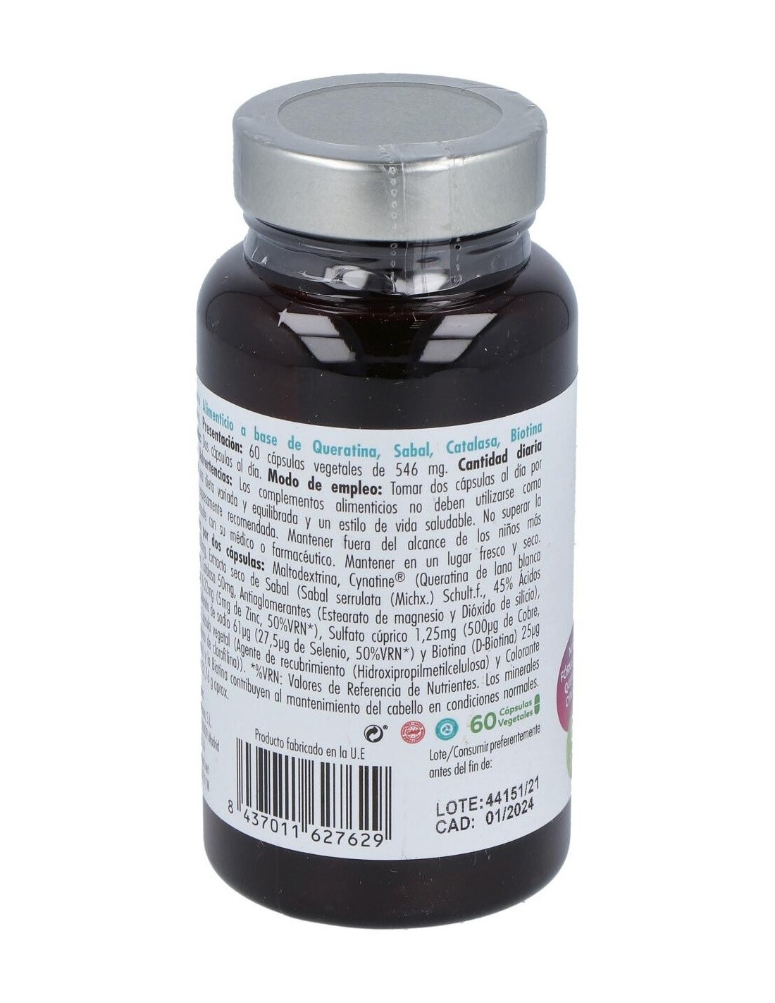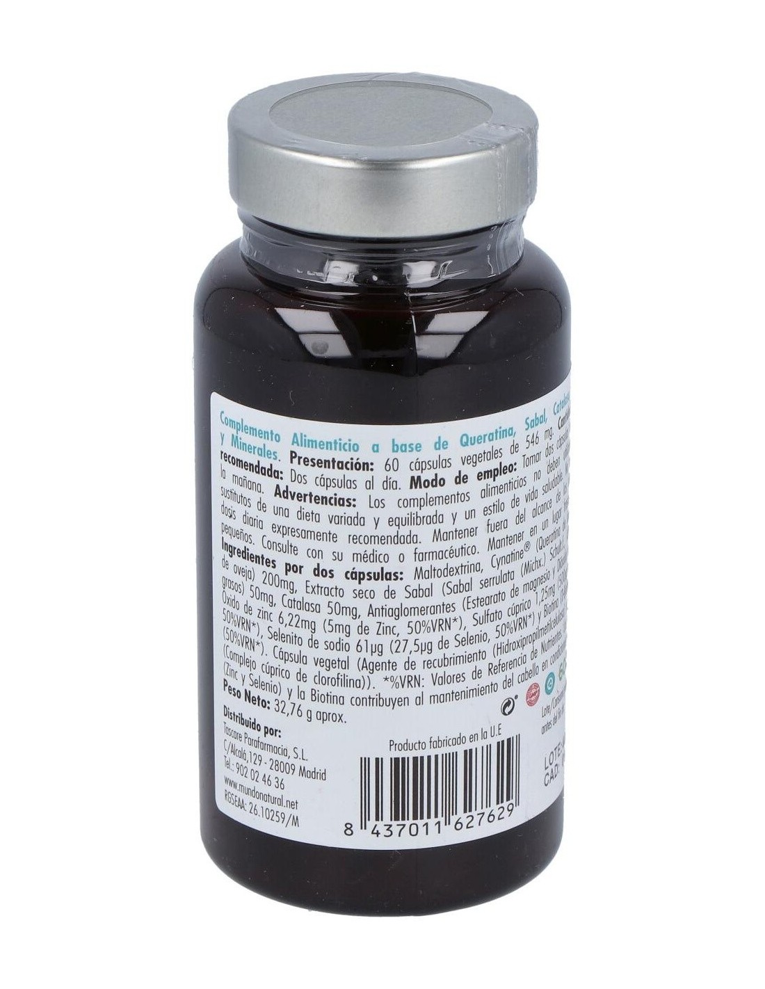 Por 2 cápsulas: Maltodextrina, Cynatine® (Queratina de lana blanca de oveja) 200 mg, Extracto seco de Sabal (Sabal serrulata (Michx.) Schult.f. 45% Ácidos grasos) 50mg, Catalasa 50 mg, Antiaglomerantes (Estearato de magnesio y Dióxido de silicio), Óxido de zinc 6,22 mg (5 mg de Zinc), Sulfato cúprico 1,25 mg (500 µg de Cobre), Selenito de sodio 61 µg (27,5 µg de Selenio), Biotina (D-Biotina) 25 µg, Cápsula vegetal (Agente de recubrimiento (Hidroxipropilmetilcelulosa), Colorante (E-171)) *Contiene soja y productos derivados de la soja. Puede contener trazas de gluten, leche, huevo, pescado y crustáceos.