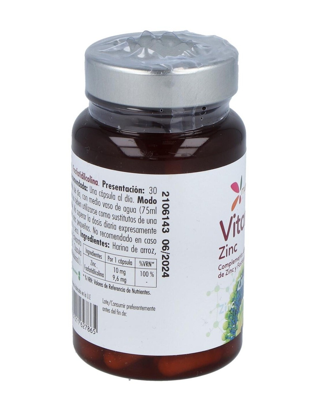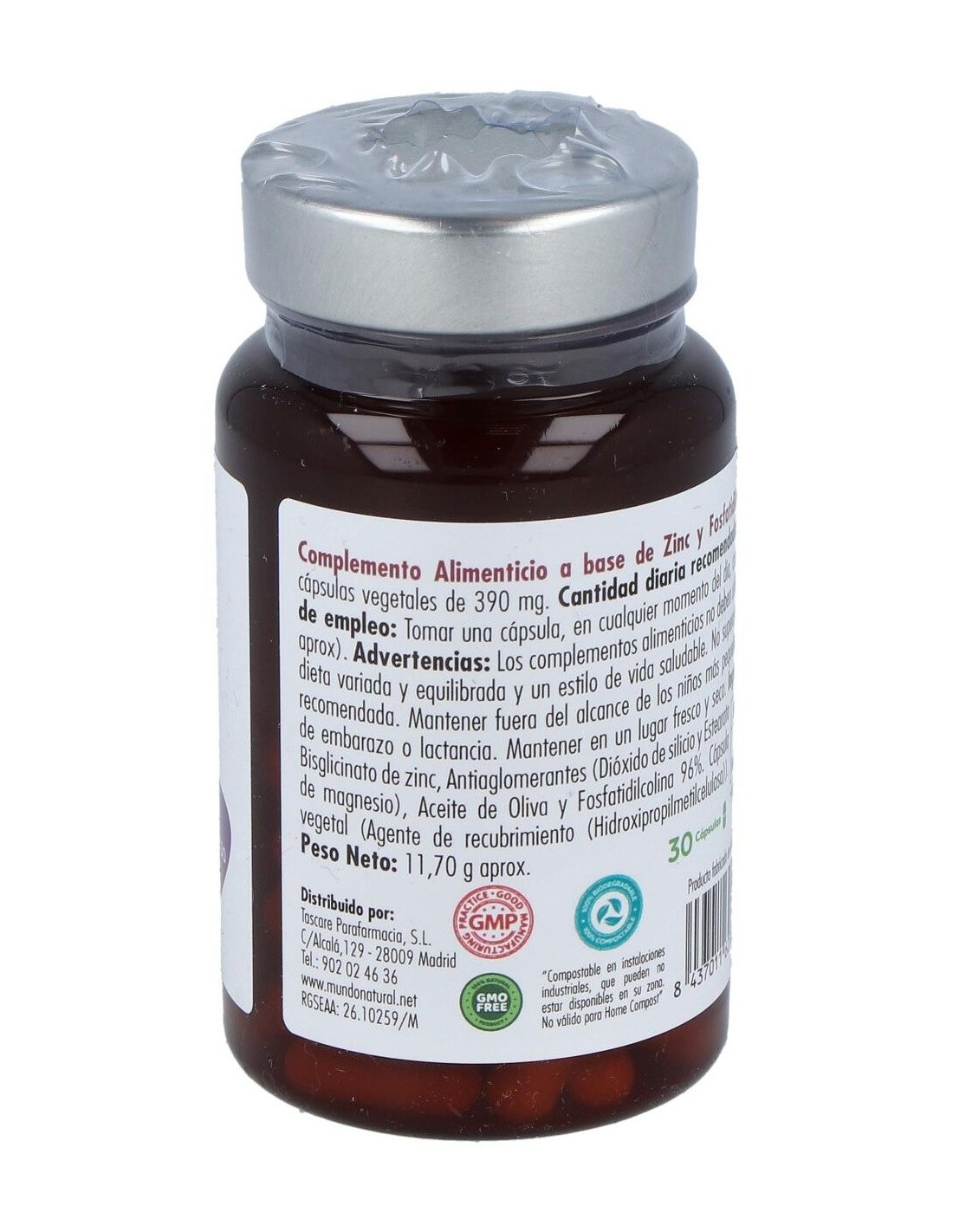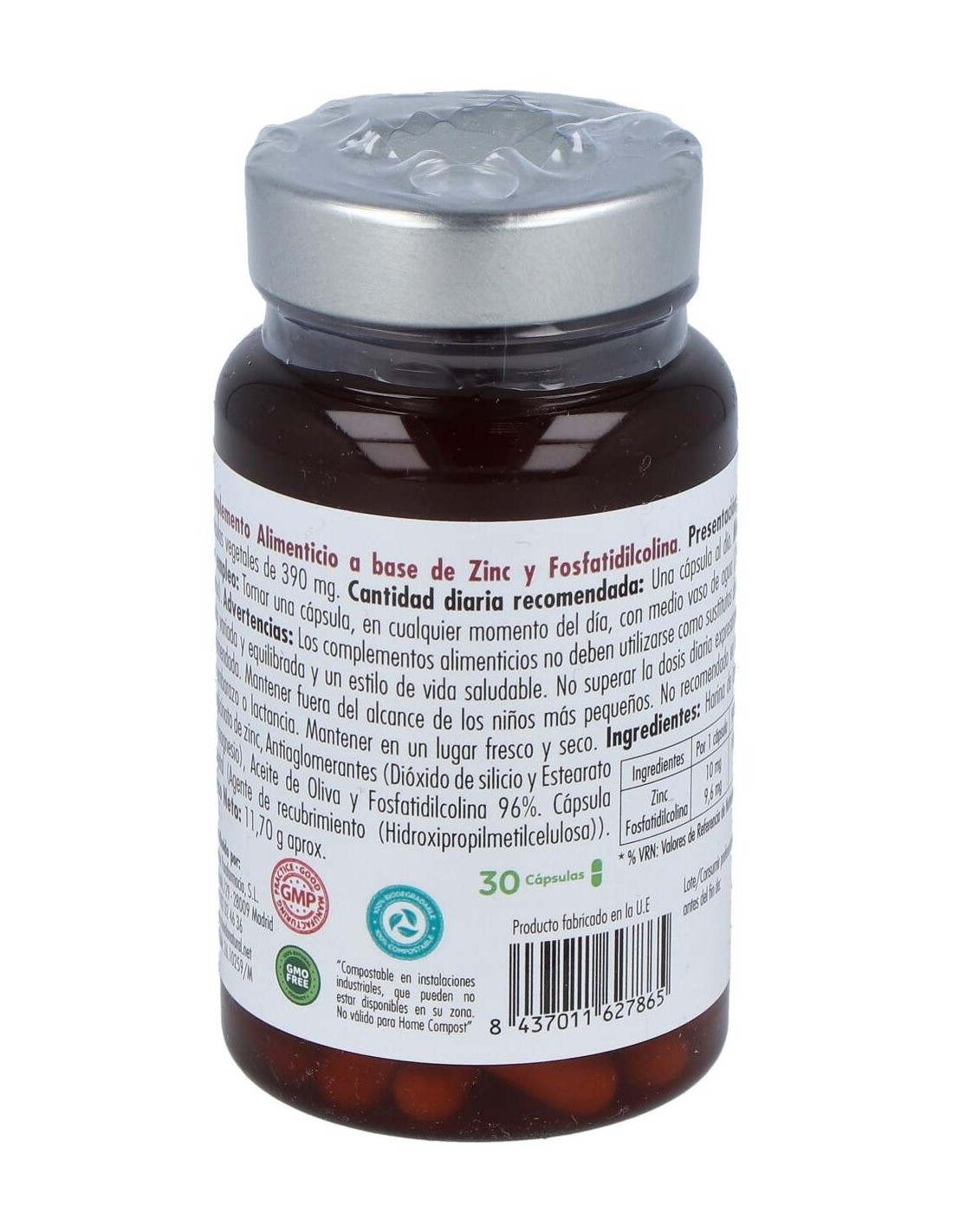 Bisglicinato de Zinc (10 mg de Zinc, 100%VRN), Aceite de Oliva y Fosfatildilcolina (96%) 9,6 mg. Harina de Arroz,. Antiaglomerantes (Estearato de Magnesio y Dióxido de silicio). Cápsula vegetal (Agente de recubrimiento (Hidroxipropilmetilcelulosa).