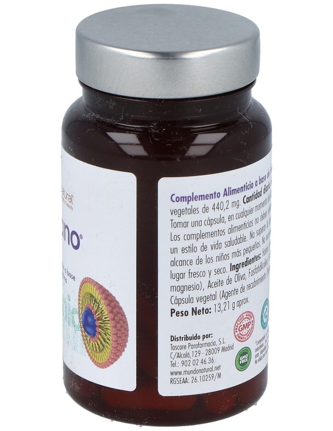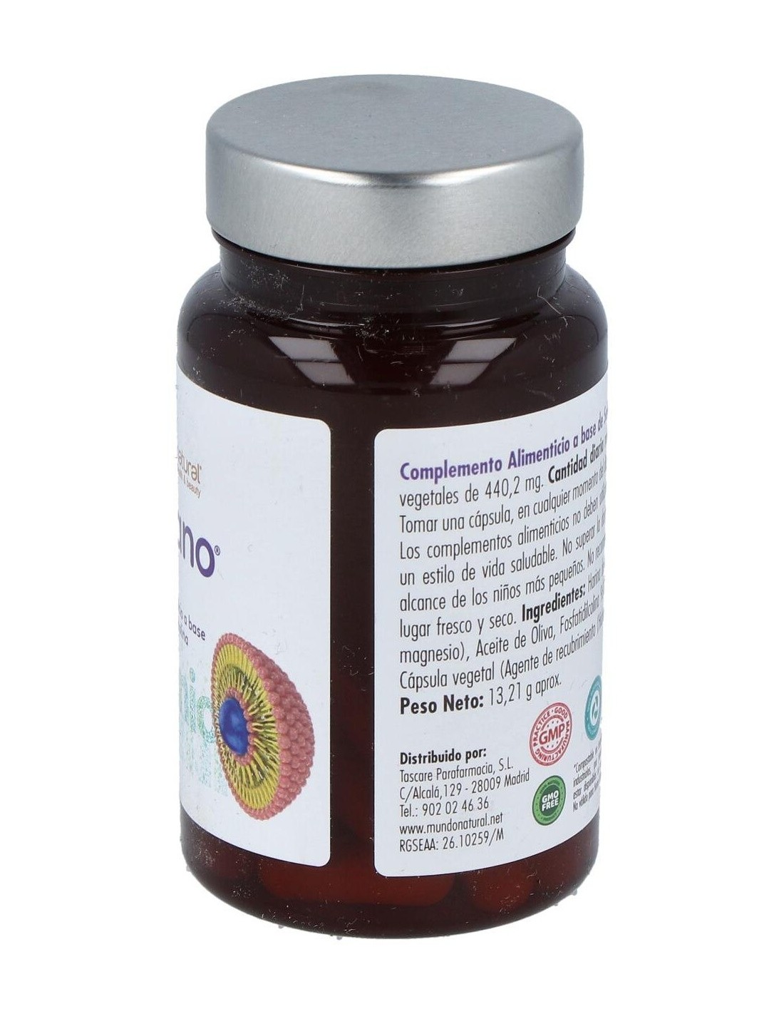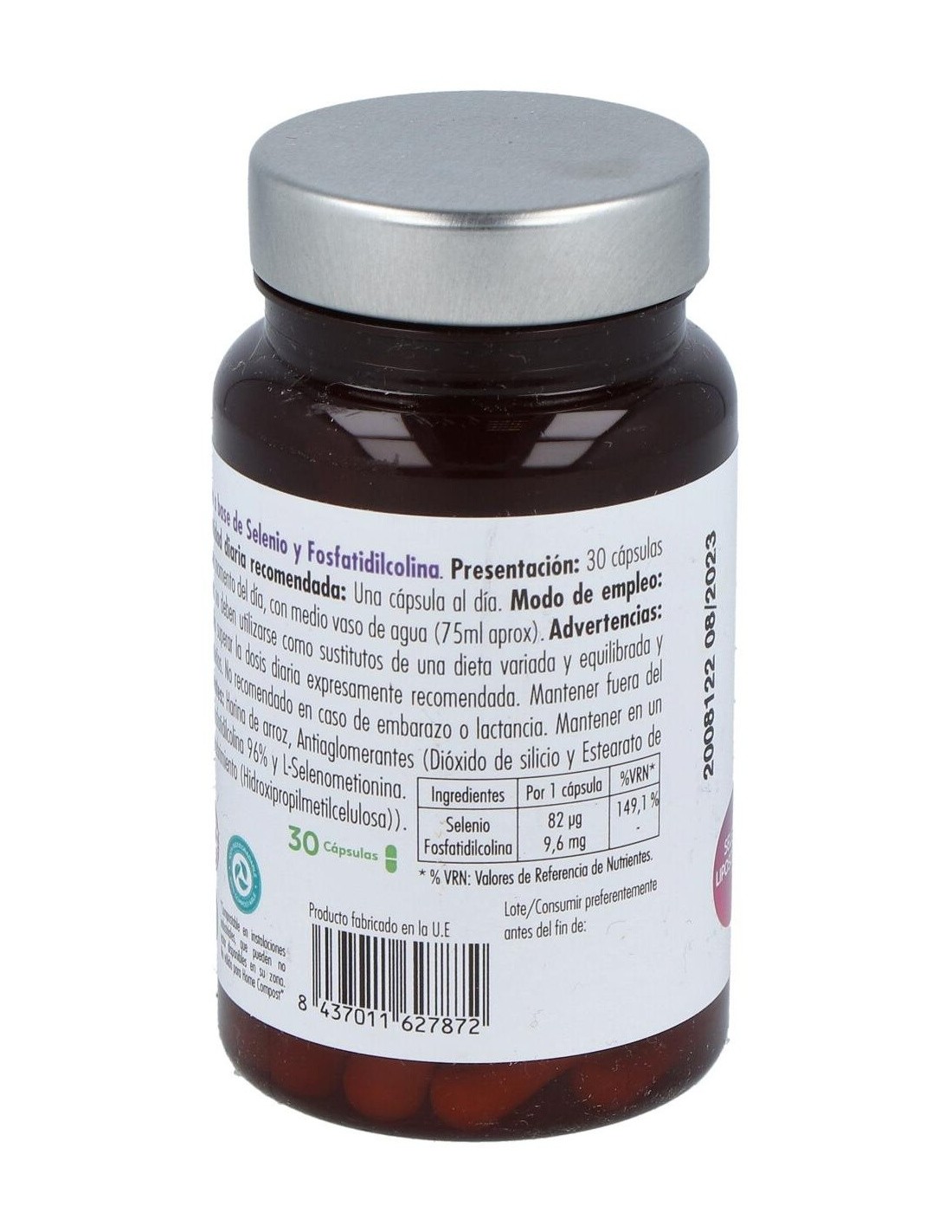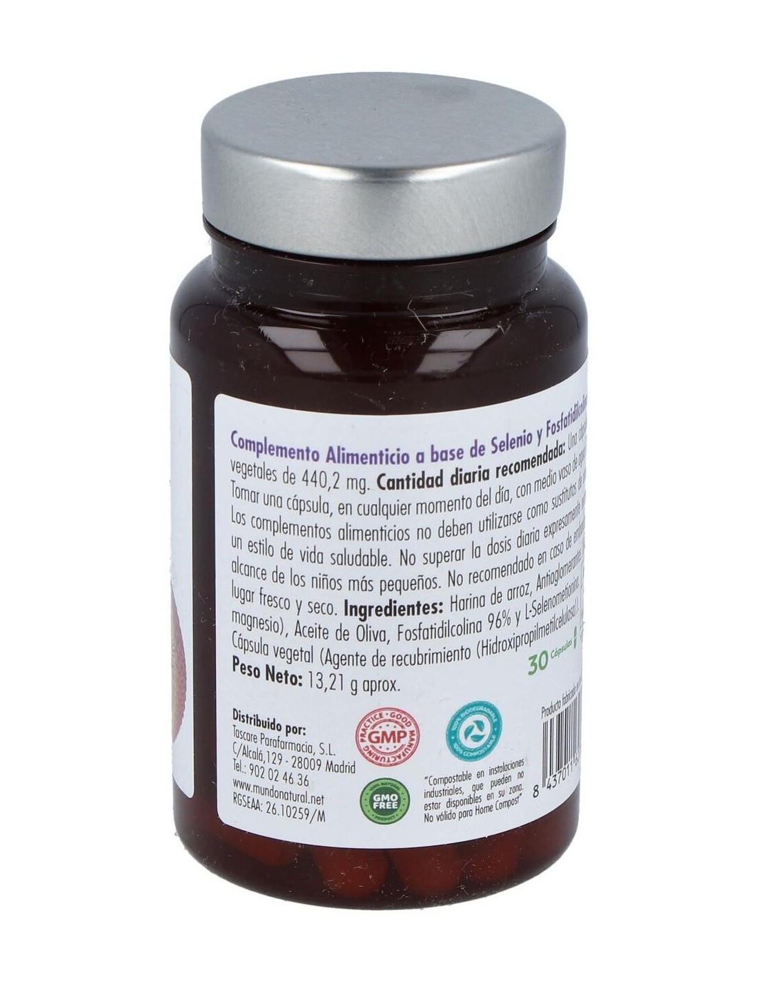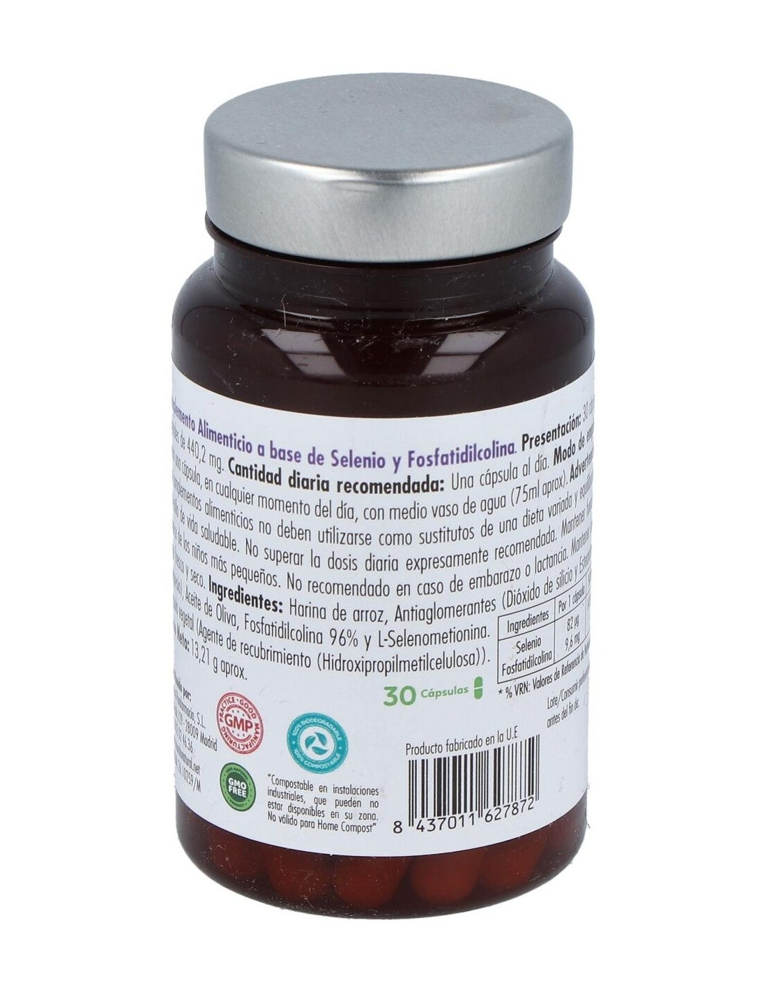 L-Selenometionina y Fosfatidilcolina 96% y . Harina de arroz, Antiaglomerantes (Dióxido de silicio y Estearato de magnesio), Aceite de Oliva, Cápsula vegetal (Agente de recubrimiento (Hidroxipropilmetilcelulosa).