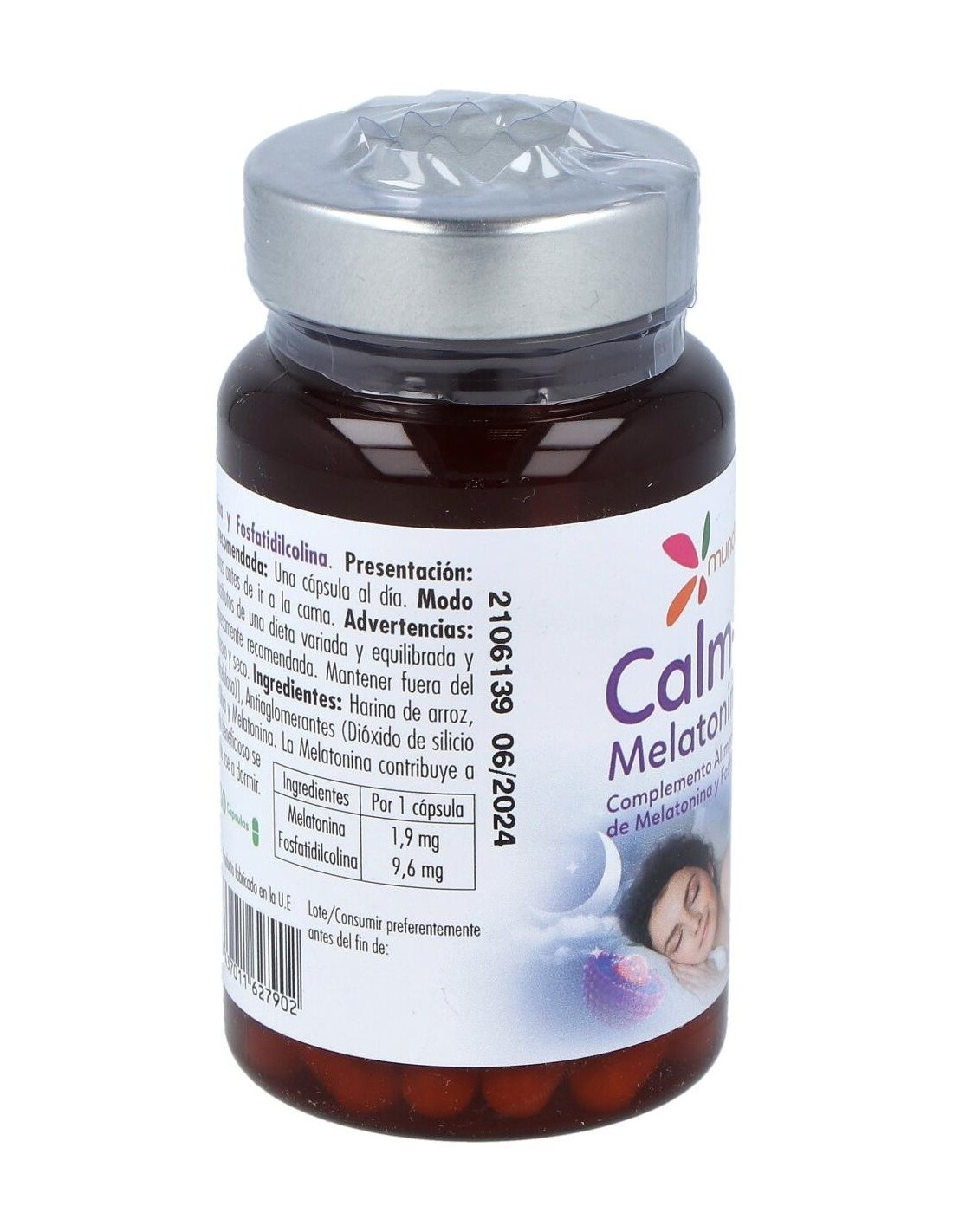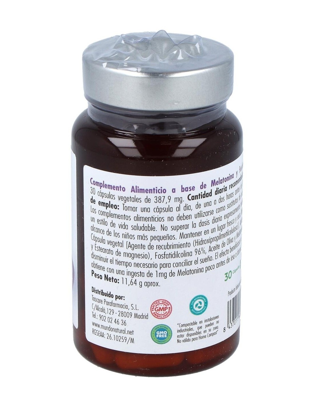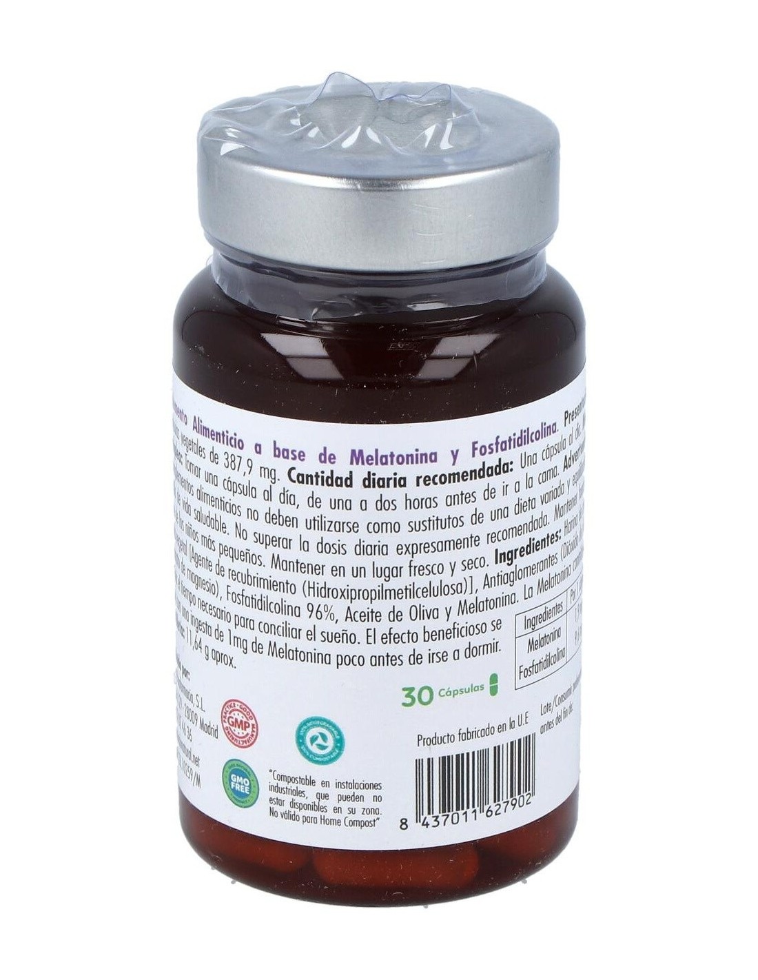 Harina de arroz, Antiaglomerantes (Dióxido de silicio y Estearato de magnesio), Fosfatidilcolina 96%, Aceite de Oliva y Melatonina. Cápsula vegetal (Agente de recubrimiento (Hidroxipropilmetilcelulosa))
