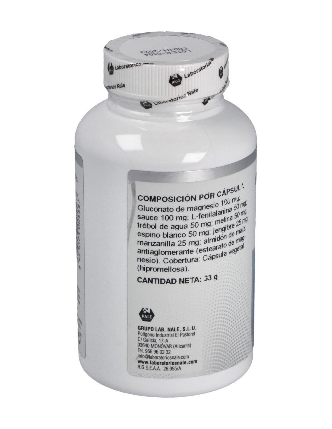 GLUCONATO DE MAGNESIO, SAUCE, L-FENILALANINA, TRÉBOL DE AGUA, MELISA, ESPINO BLANCO, MANZANILLA, JENGIBRE. CÁPSULA VEGETAL (HIPROMELLOSA)