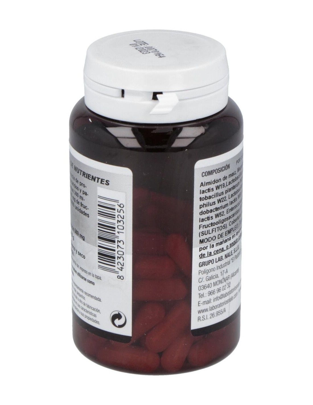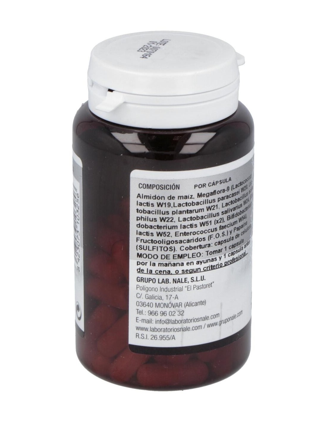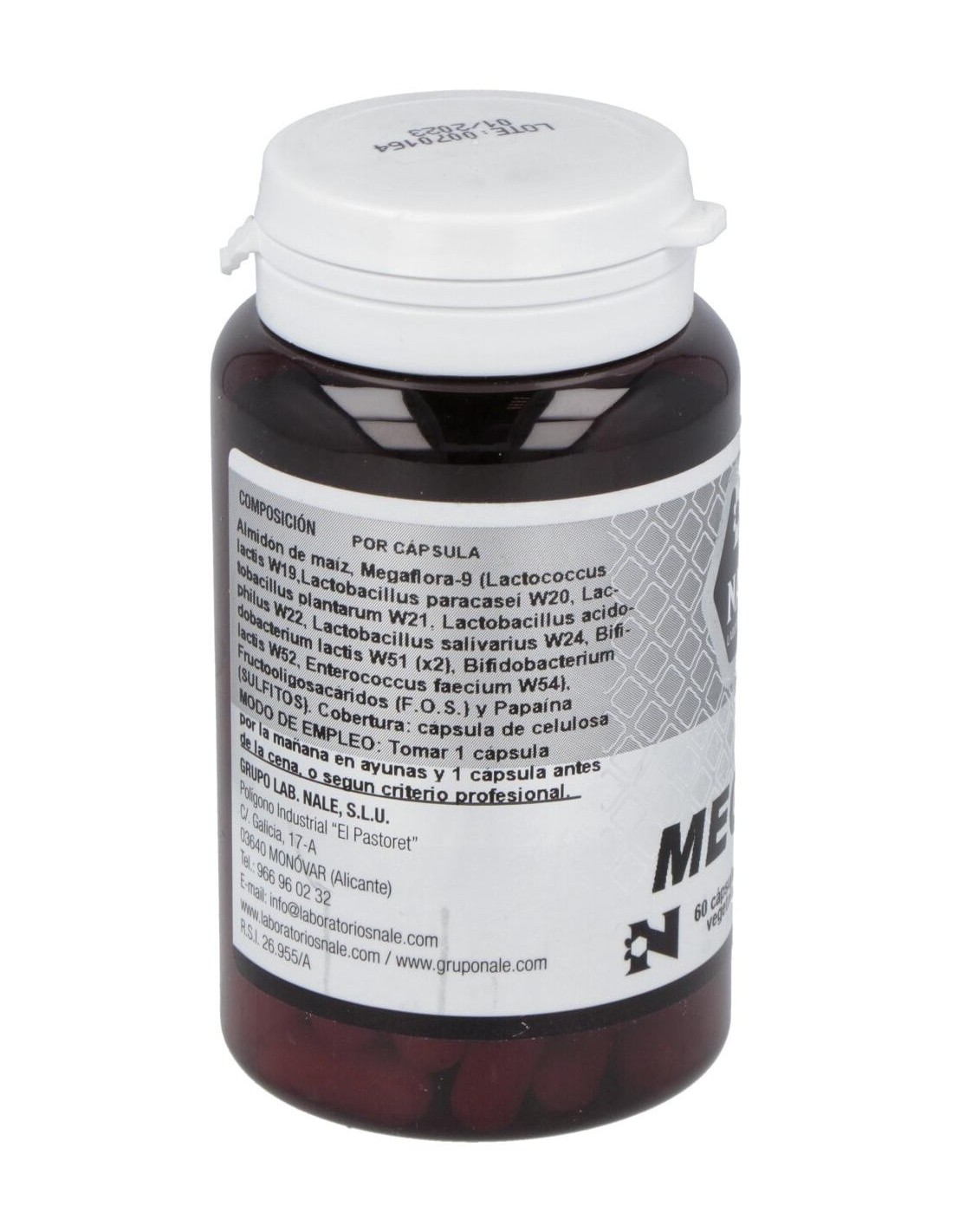 Megaflora-9 (Lactococcus lactis W19,Lactobacillus paracasei W20, Lactobacillus plantarum W21, Lactobacillus acidophilus W22,Lactobacillus salivarius W24, Bifidobacterium lactis W51 (x2), Bifidobacterium lactis W52, Enterococcus faecium W54), almidón de maíz, Fructooligosacáridos (F.O.S.) y Papaína. Cobertura: cápsula de celulosa.