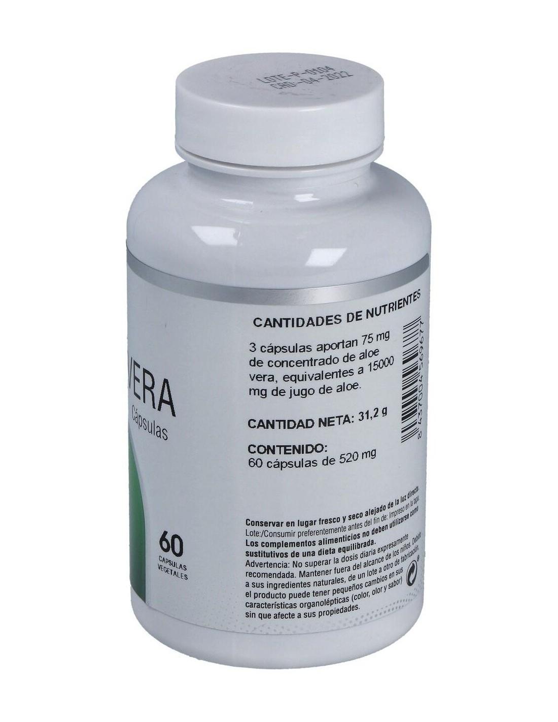 Aloe Vera Concentrado 25 mg/cápsula, equivalente a 5000 mg de jugo de aloe. Antiaglomerante (Estearato de Magnesio). Cápsula Vegetal (Hipromellosa).
