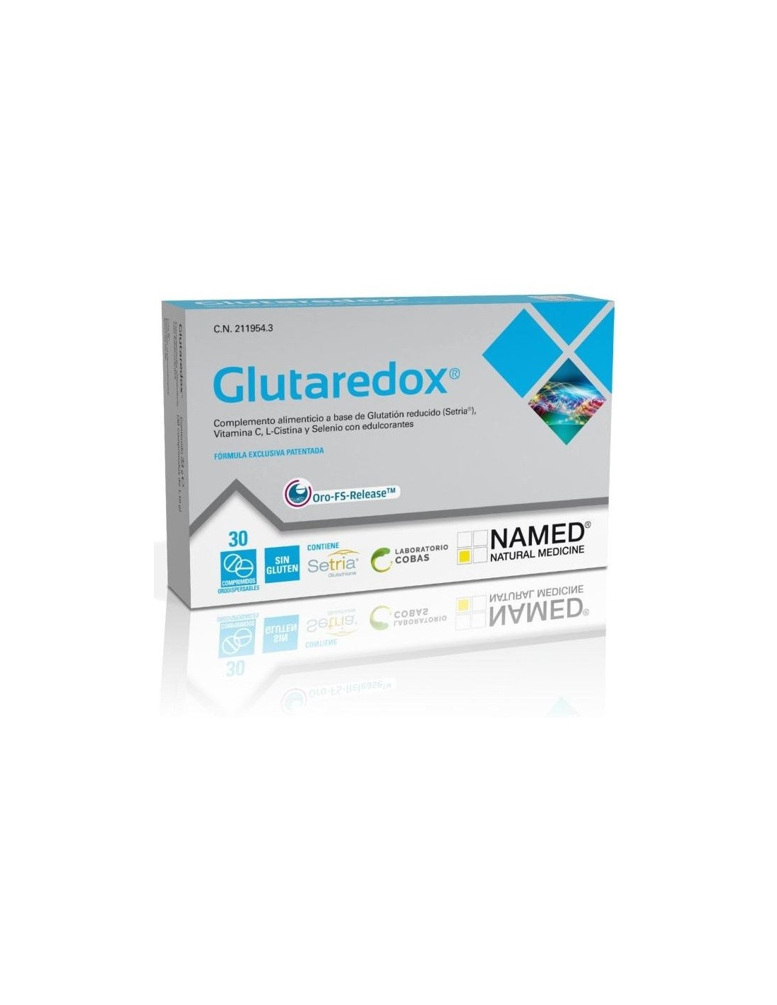 NAMEDGlutaredox es un innovador complemento alimenticio que contiene una alta dosis de glutatión reducido (Setria®), selenio, vitamina C y L-cistina cuya administración se realiza mediante una innovadora tecnología de liberación diferenciada Oro-FastSlow-Release (Oro-FS-ReleaseTM) que garantiza la máxima absorción de glutatión reducido, el mayor antioxidante y detoxificante del cuerpo. El selenio y la vitamina C contribuyen a proteger a las células frente al daño oxidativo. Comprimidos orodispensables.