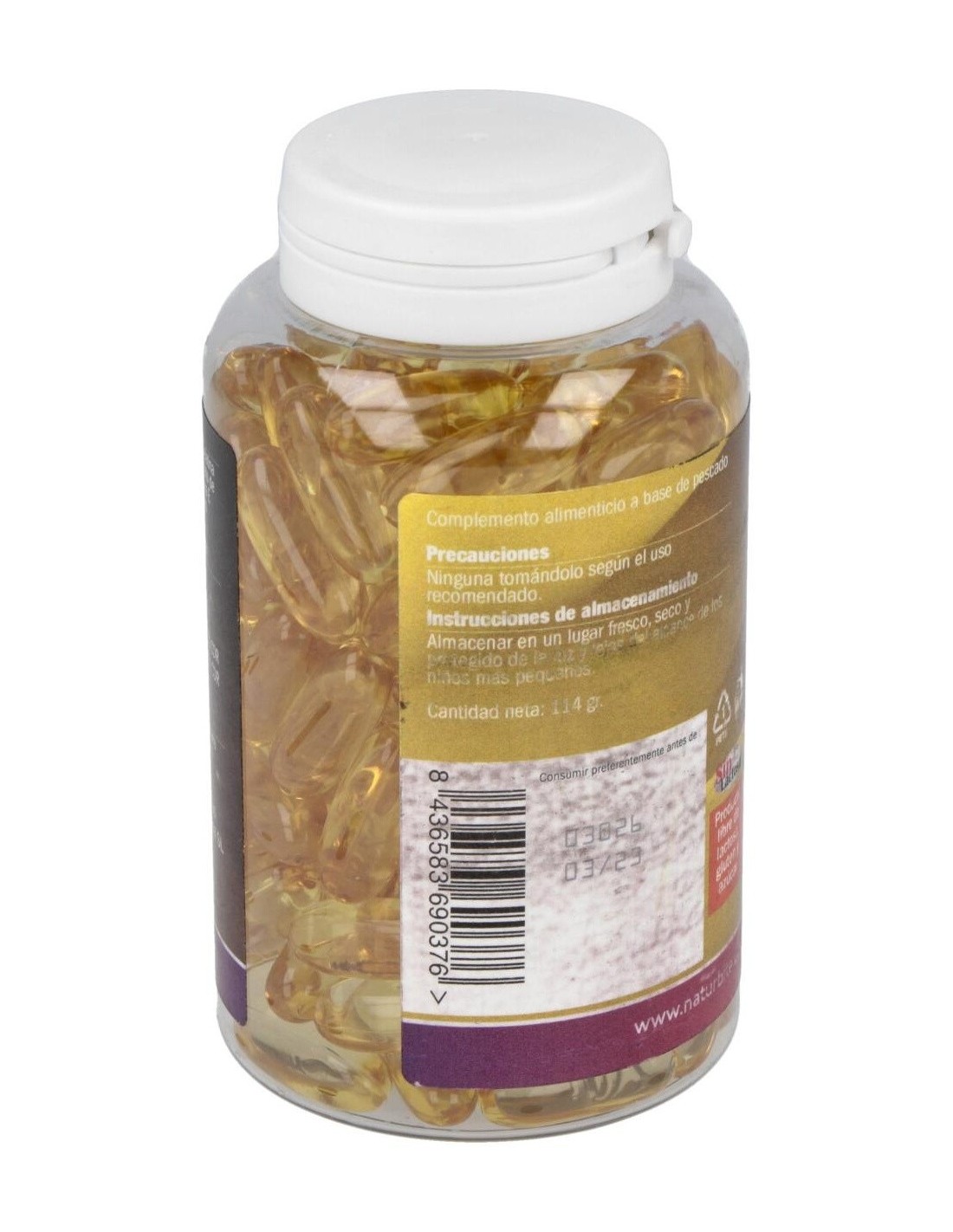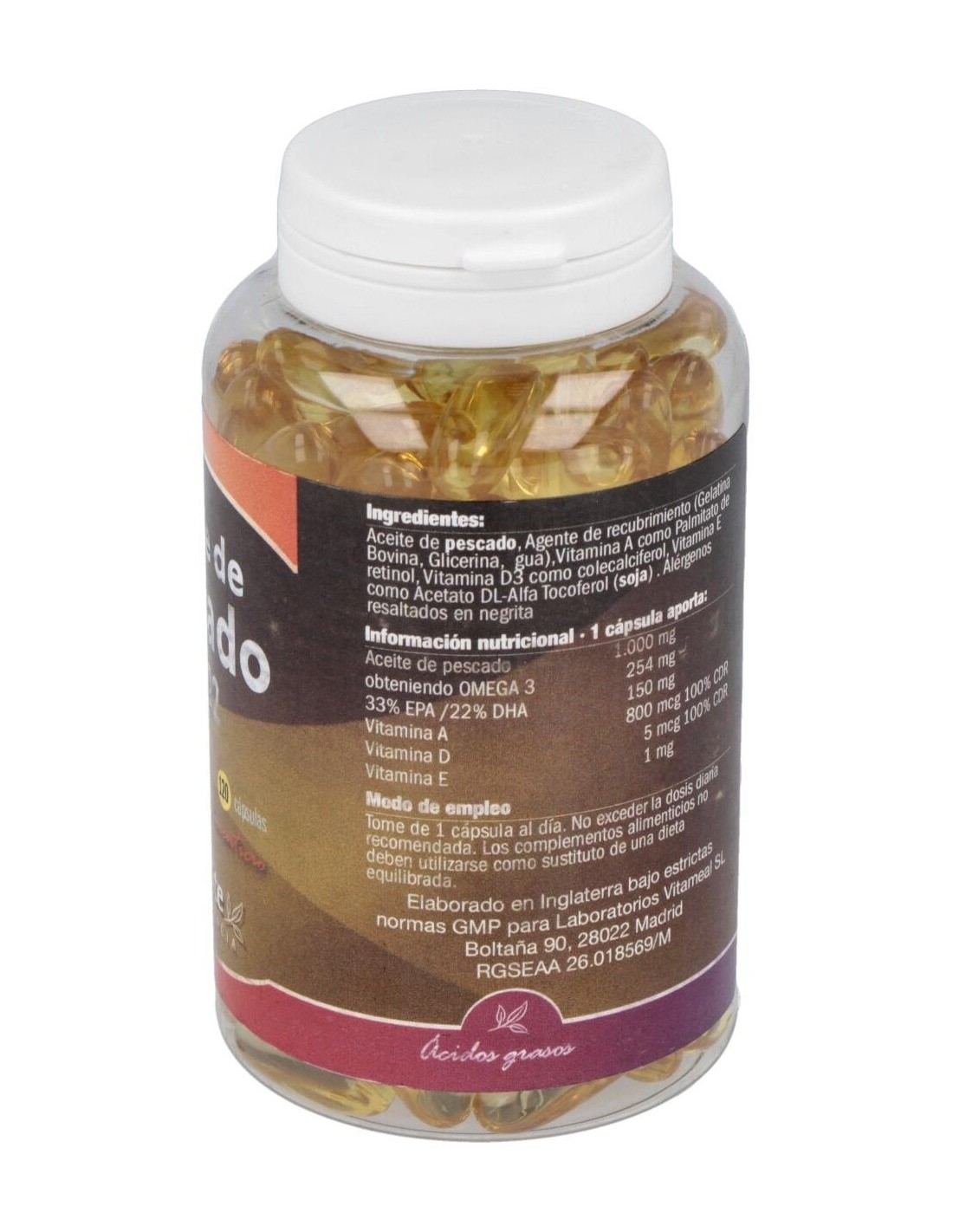 Cápsulas de aceite de pescado obtenido de atún, salmón, fletán, caballa y bacalao procedentes del Atlántico Sur, rico en omega 3, grasa necesaria para el fortalecimiento de las neuronas y demás funciones del organismo. Además favorecen la salud cardiovascular, reduciendo el riesgo de sufrir afecciones relacionadas con el corazón.