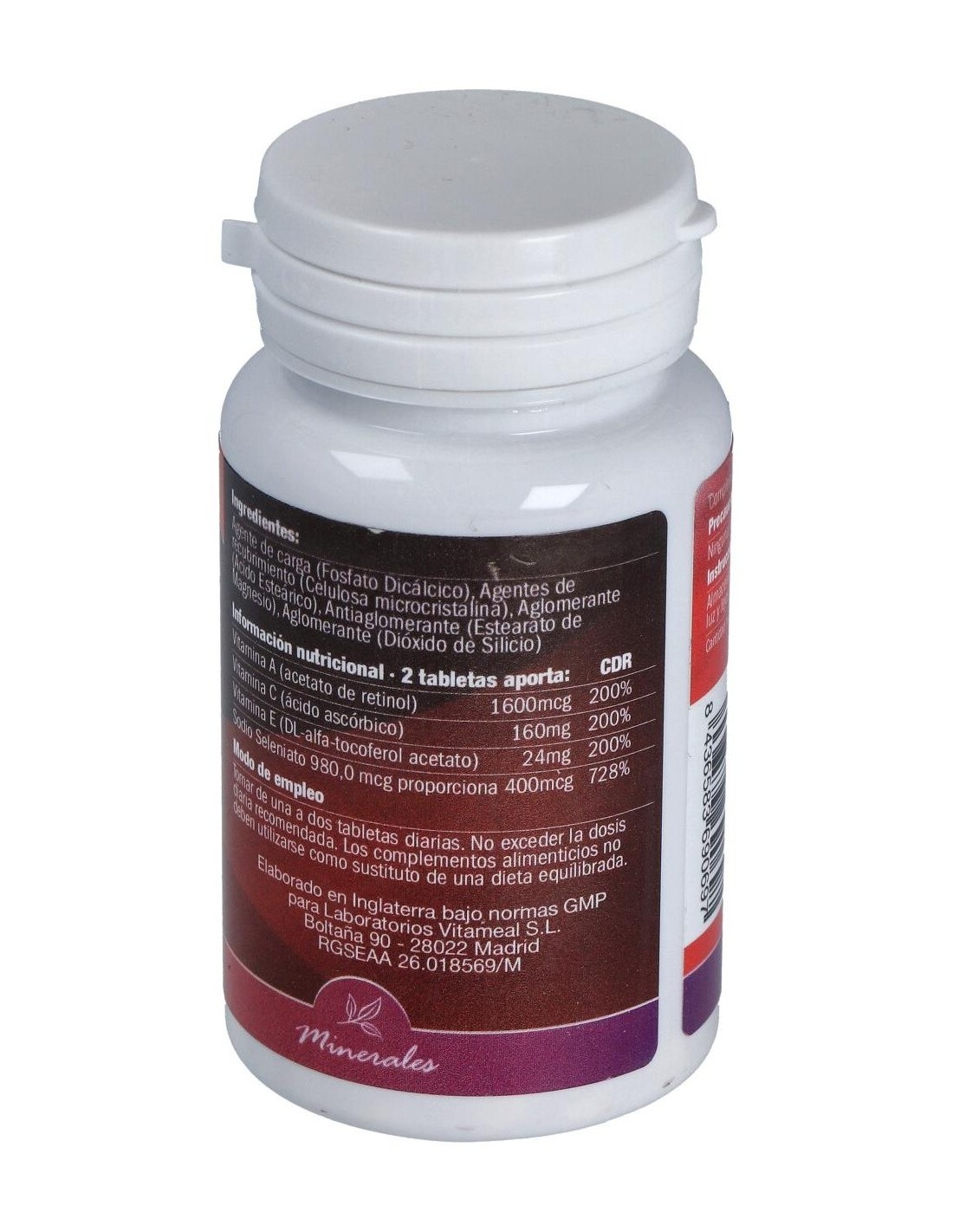 Vitamina E DL-alfa-tocoferol acetato) 12 mg, Sodio Seleniato 200 mcg. Fosfato dicálcico, Celulosa microcristalina, Ácido esteárico, Dióxido de Silicio, Estearato de magnesio.