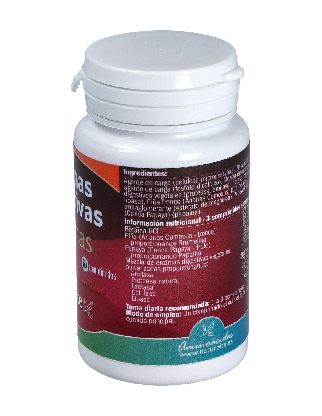 Celulosa microcristalina, Betaina HCI, fosfato dicálcico, mezcla de enzimas digestivas vegetales (proteasa, amilasa, lactasa, celulasa y lipasa), piña tronco, bromelaina, estearato de magnesio, papaya fruto, papaina.