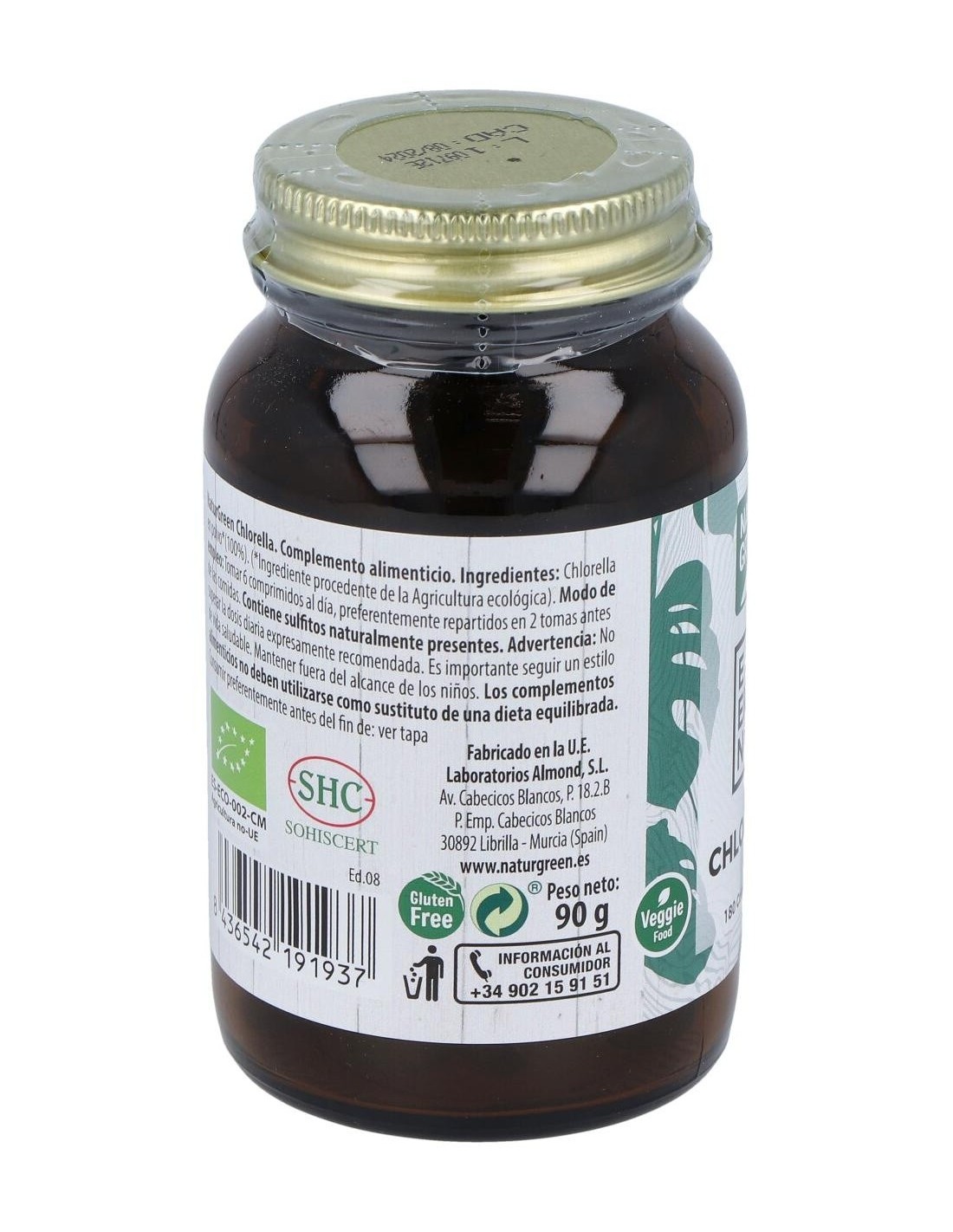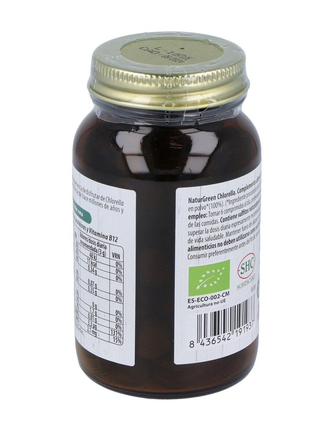 Naturgreen Chlorella ecológica 180comp es un complemento alimenticio a base de lga Chlorella, alga verde usada como complemento nutricional para reforzar el sistema inmunológico.