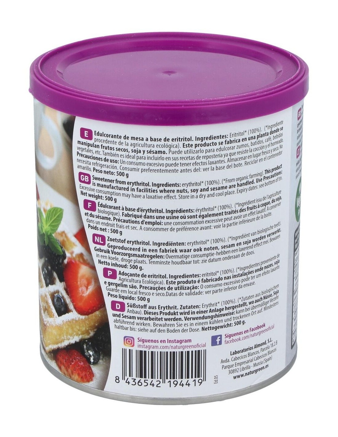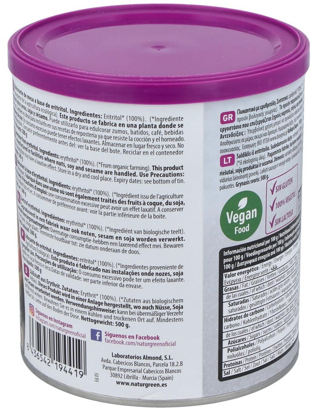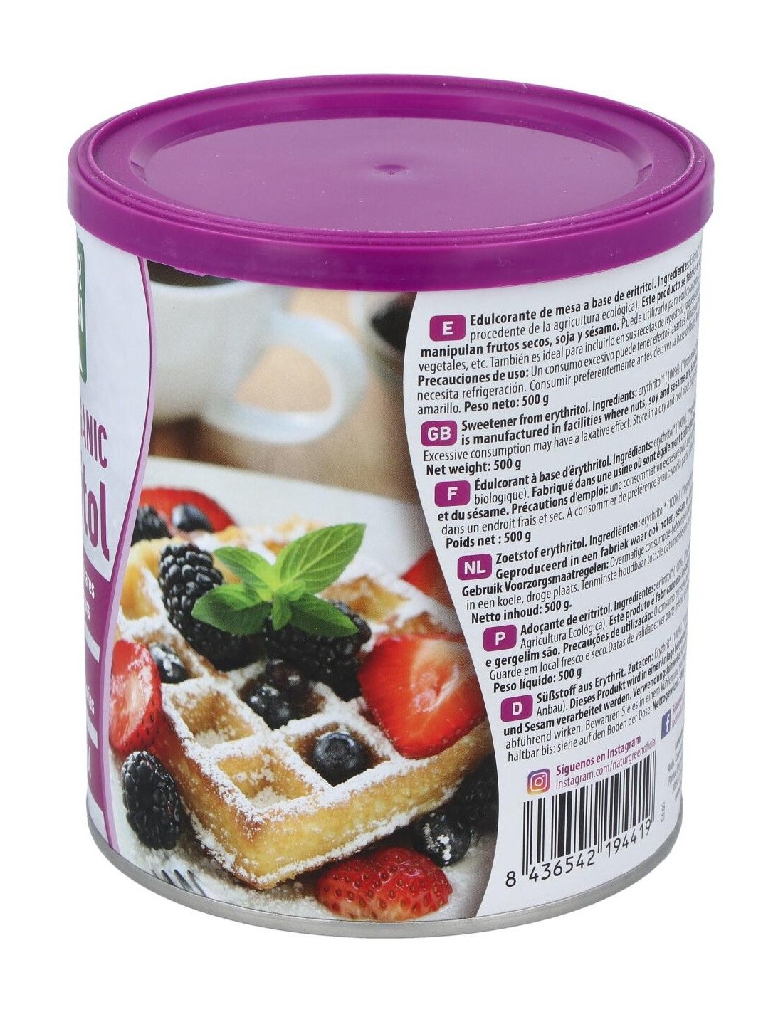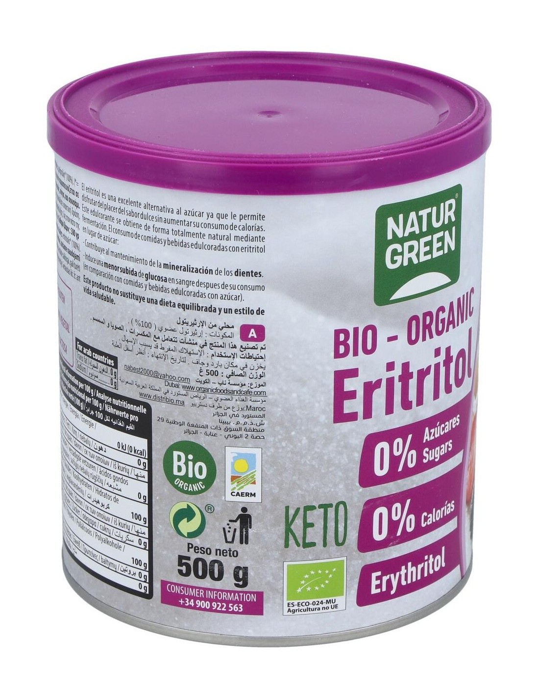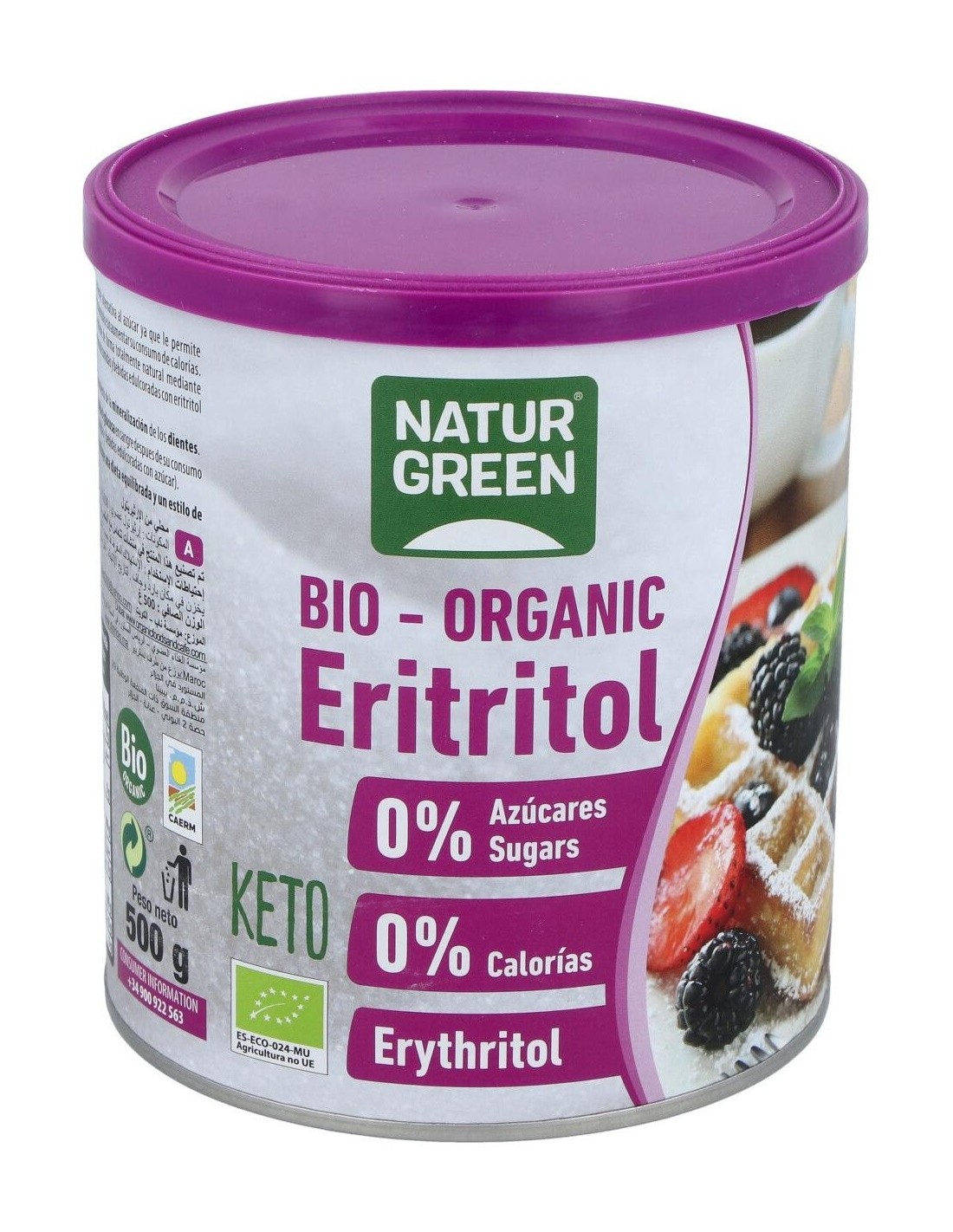 Natur-greeneritritol Bio 500 G es un edulcorante de mesa a base de eritritol ecológico. El eritritol es un polialcohol ultilizado como edulcorante en la industria alimentaria que se obtiene a través de la fermentación natural de frutas, maíz, trigo, liquen, algas y otros productos naturales. Fuente energética recomendada para diabéticos, obesos, enfermos coronarios y prevención dental; ya que no afecta a la presión sanguínea y no es cancerígeno.