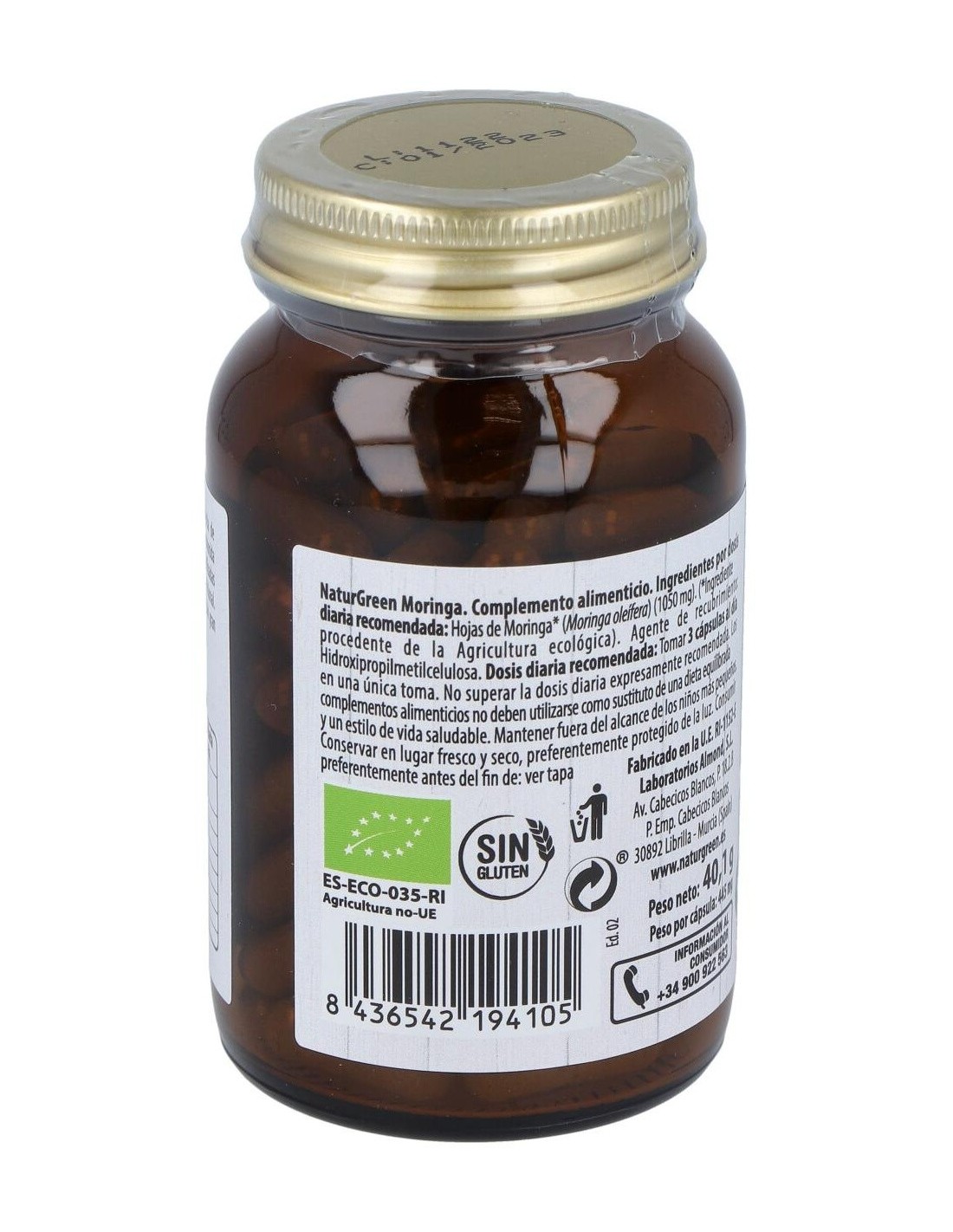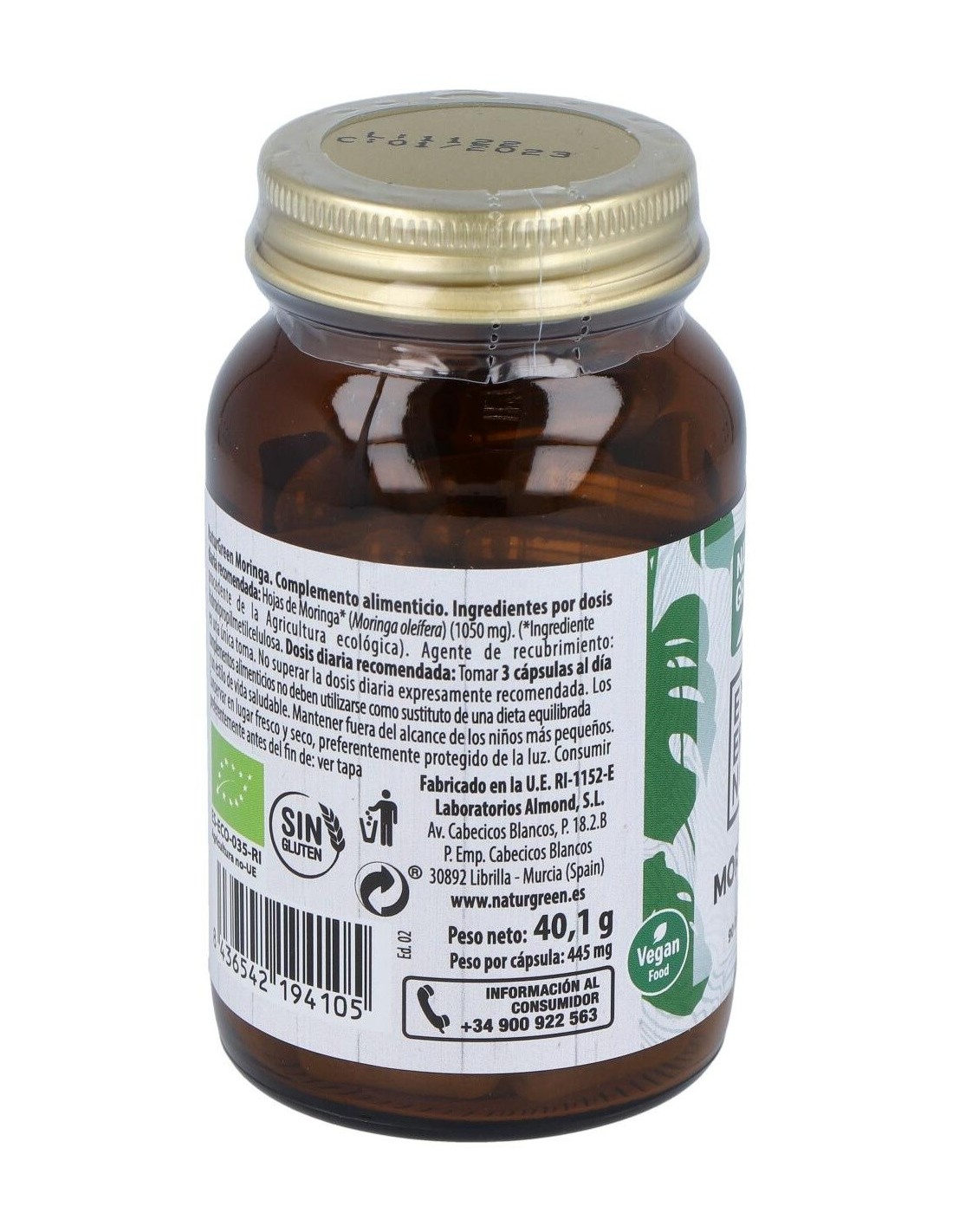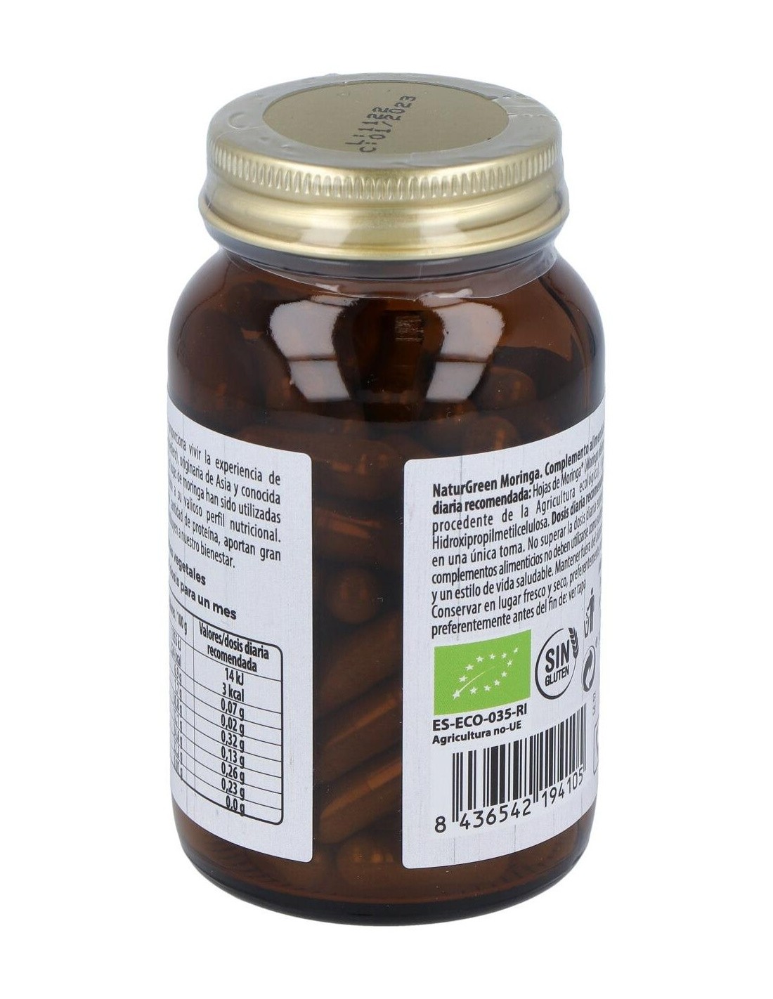 NaturGreen Moringa Bio 90 Cápsulas complemento alimenticio en base de Hojas de Moringa oleífera ecológica en cápsulas. La moringa es una planta tropical llena de propiedades.