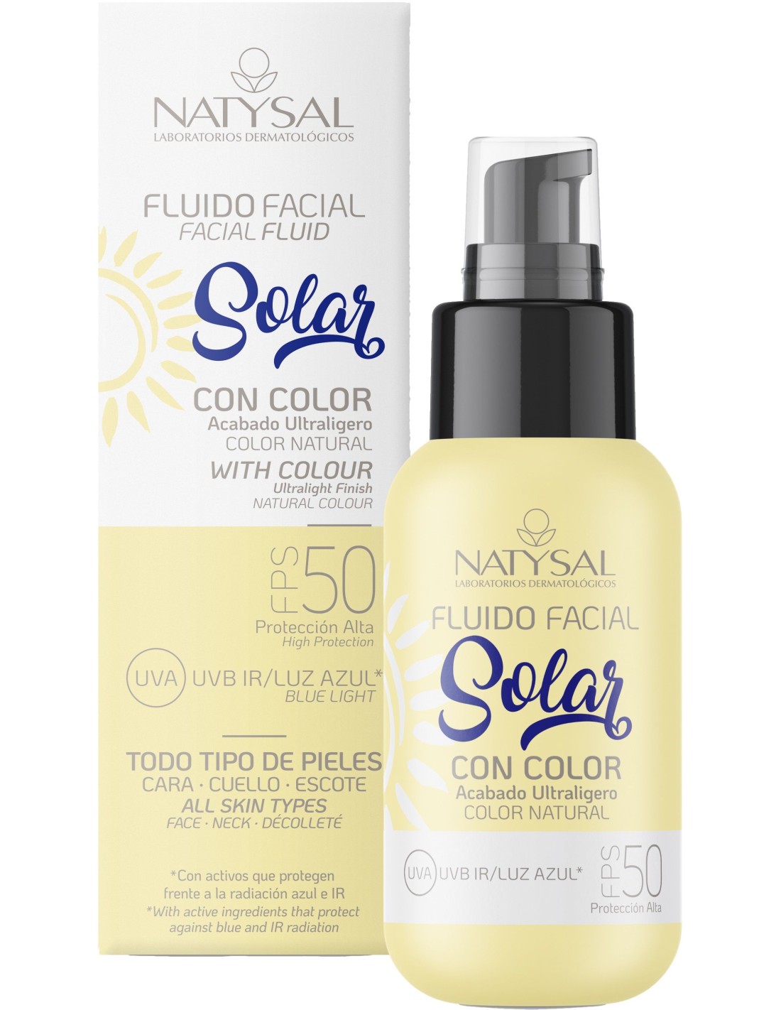 NATYSALFluido facial solar con color FPS 50 Protección Alta de acabado ultraligero para todo tipo de pieles. Con activos que protegen frente a la radiación infrarroja y luz azul. UVA-UVB IR/LUZ AZUL. Tacto ligero. PMMA free (sin microplásticos). Sin nanopartículas. Resistente al agua. Alta tolerancia a pieles sensibles. Sin alcohol. Sin perfume. Dermatológicamente testado.