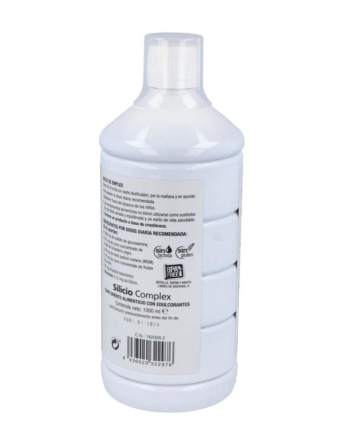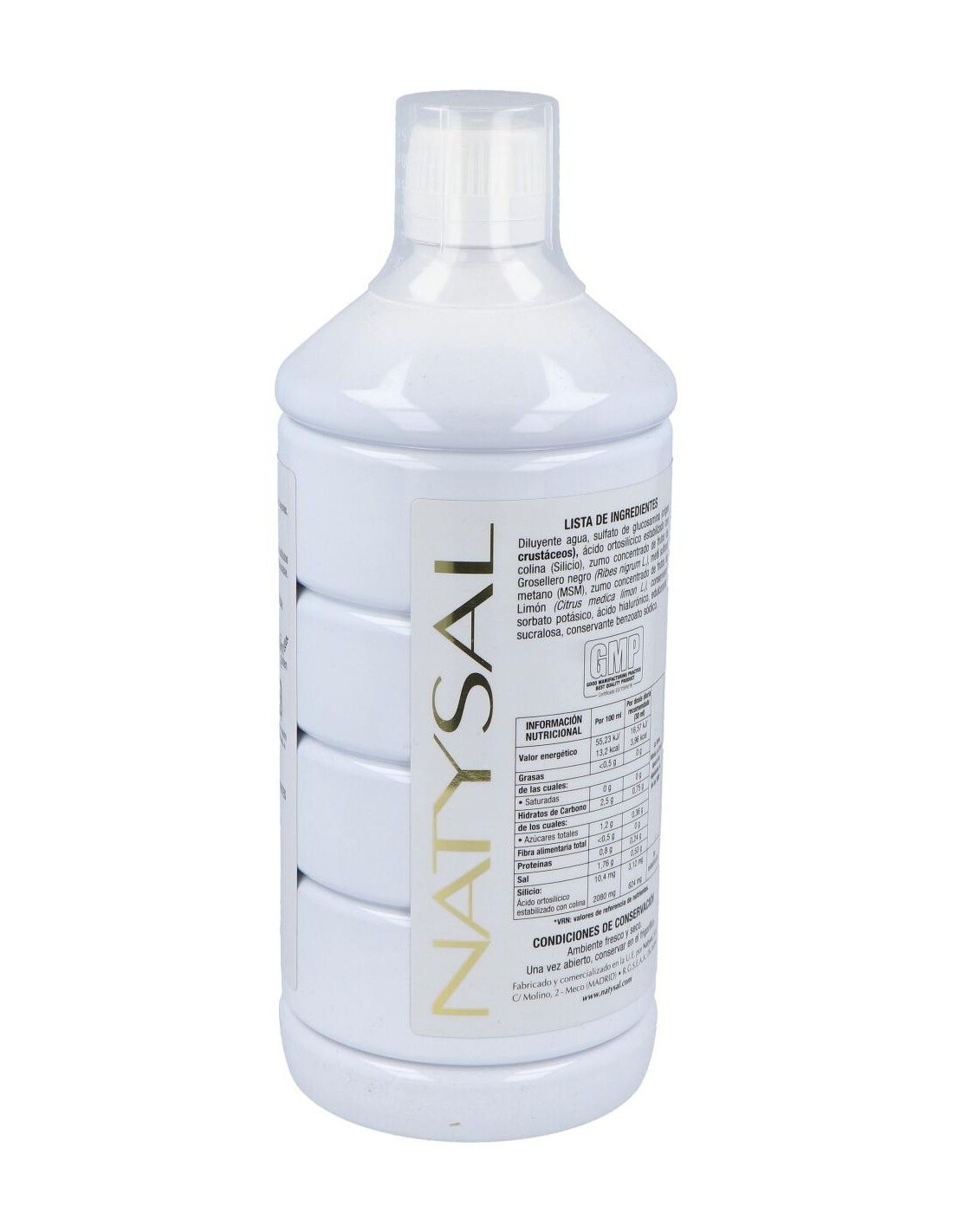 DILUYENTE AGUA, SULFATO DE GLUOOSAMINA, ÁCIDO ORTOSILFCICO ESTABILIZADO CON COLINA (SILICIO), ZUMO CONCENTRADO DE FRUTOS DE GROSELLERO NEGRO (RIBES NIGRUM L.), METIL SULFONIL METANO (MSM), ZUMO CONCENTRADO DE FRUTOS DE LIMÓN (CRTIUS MEDICA LIMÓN L.), CONSERVANTE SORBATO POTÁSICO, ÁCIDO HIALURÓNICO, EDULCORANTE SUCRALOSA, CONSERVANTE BENZOATO SÓDICO.