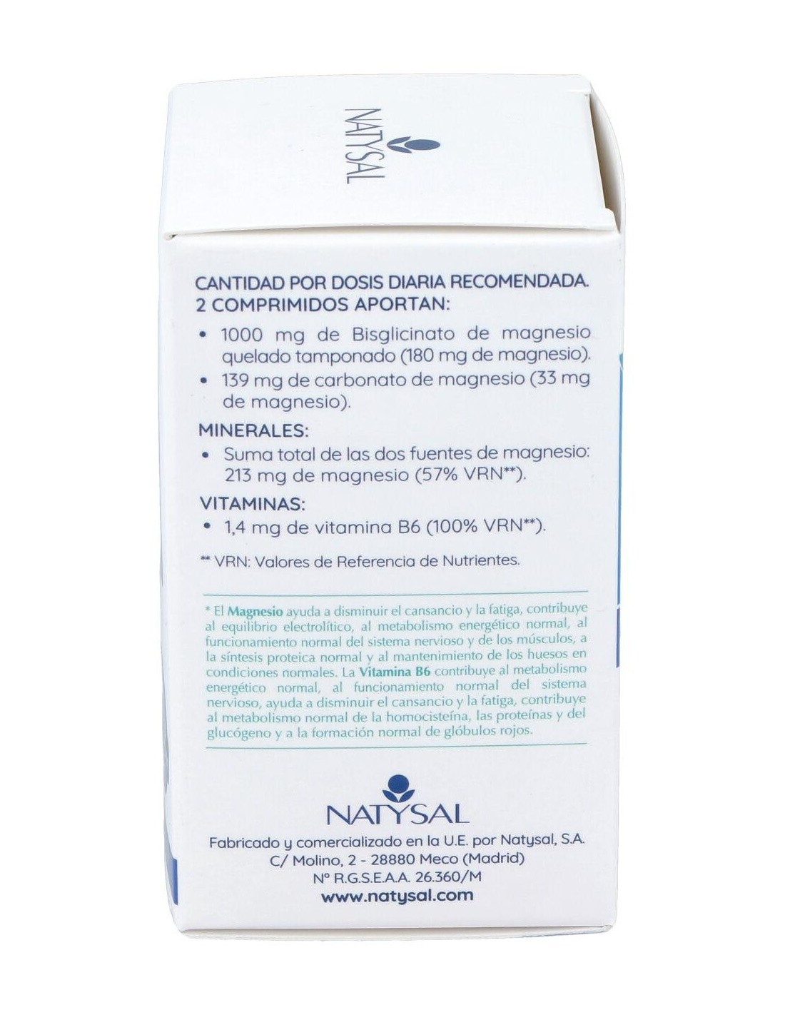 Complemento alimenticio elaborado a base de magnesio puro y vitamina B6, para mantener la salud en huesos, músculos y mejorar la energía corporal. El magnesio es un mineral que ayuda a disminuir el cansancio y la fatiga, contribuye al equilibrio electrolítico, al metabolismo energético normal, al funcionamiento normal del sistema nervioso y de los músculos. Ayuda a la síntesis proteica normal y al mantenimiento de los huesos en condiciones normales. La vitamina B6 contribuye al funcionamiento normal del sistema nervioso y ayuda a disminuir el cansancio y la fatiga. Favorece la salud normal de glóbulos rojos.