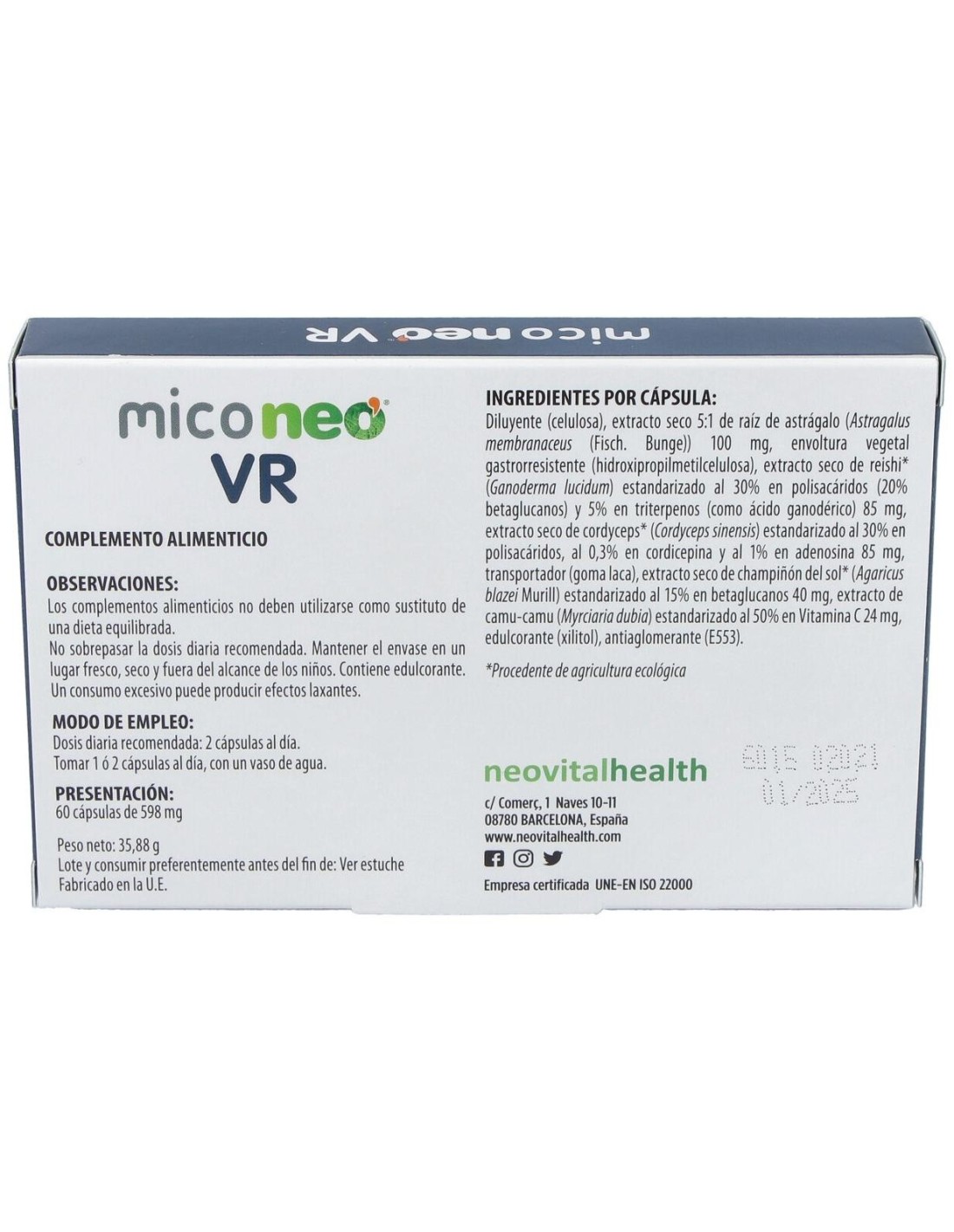 Componentes de Mico Neo VR: Astrágalo, planta medicinal con propiedades antibacterianas, antiinflamatorias, analgésicas, expectorantes, antioxidantes, diuréticas, vasodilatadoras, cicatrizantes, antidiabéticas, hipotensoras, inmunoestimulantes y antitumorales; Reishi, potente antiinflamatorio y antioxidante natural que tiene propiedades antitumorales y actúa como regulador hormonal y además normaliza el buen funcionamiento del corazón; Cordyceps, aporta vitalidad al cuerpo, potencia el ciclo de ATP y está muy recomendado en deportistas; Champiñón del Sol, potente inmunomodulador muy útil en el tratamiento de enfermedades autoinmunes; Camu Camu, una de las mayores fuentes de Vitamina C, conocida por su potencia en el sistema inmunológico y emoliente.