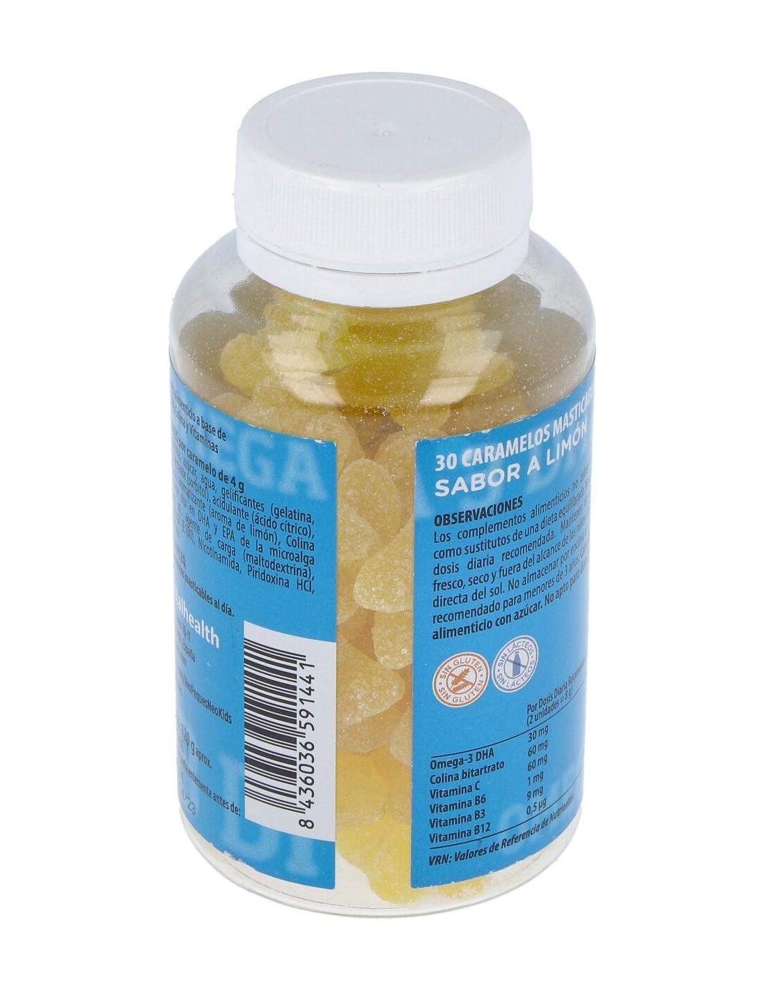 JARABE DE GLUCOSA, AZÚCAR, AGUA, GELIFICANTES (GELATINA, ALMIDÓN), HUMECTANTE (SORBITOL), ACIDULANTE (ÁCIDO CÍTRICO), ÁCIDO ASCÓRBICO, AROMATIZANTE (AROMA DE LIMÓN), COLINA BITARTRATO, ACEITE DE ALGAS RICO EN OMEGA-3 DHA, AGENTE DE CARGA (MALTODEXTRINA), COLORANTE NATURAL (E100), NICOTINAMIDA, PIRIDOXINA HCL, CIANOCOBALAMINA.