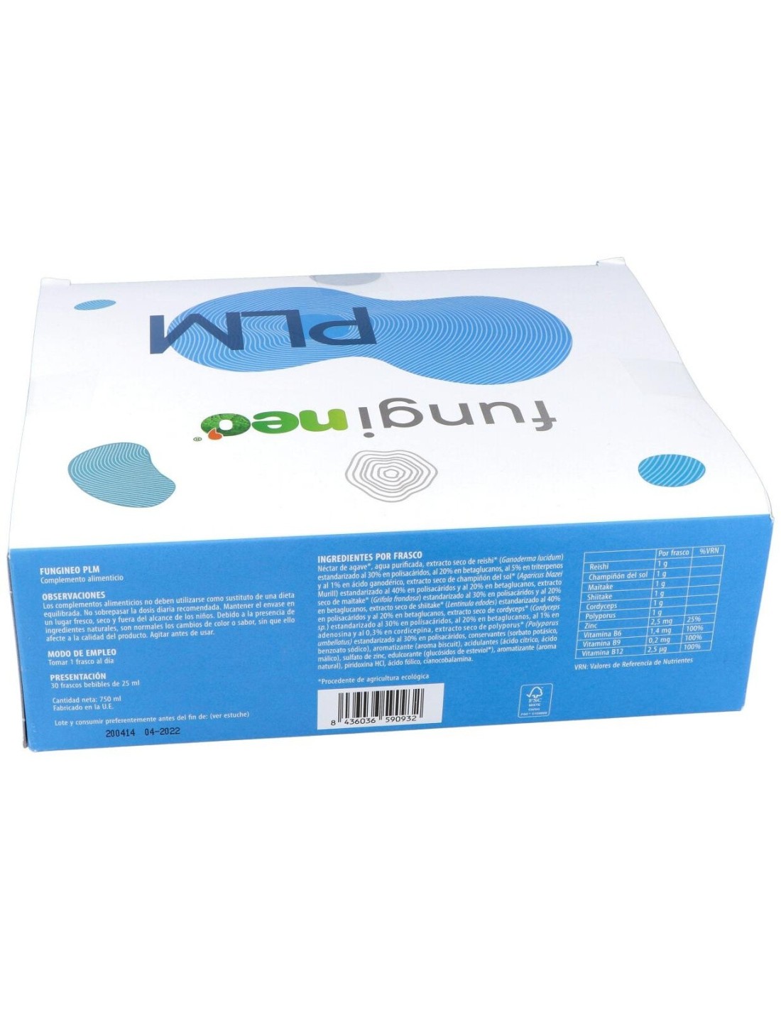 Néctar de ágave*, agua purificada, extracto seco de reishi* (Ganoderma lucidum) estandarizado al 30% en polisacáridos, al 20% en betaglucanos, al 5% en triterpenos y al 1% en ácido ganodérico, extracto seco de champiñón del sol* (Agaricus blazei Murill) estandarizado al 40% en polisacáridos y al 20% en betaglucanos, extracto seco de maitake* (Grifola frondosa) estandarizado al 30% en polisacáridos y al 20% en betaglucanos, extracto seco de shiitake* (Lentinula edodes) estandarizado al 40% en polisacáridos y al 20% en betaglucanos, extracto seco de cordyceps* (Cordyceps sp.) estandarizado al 30% en polisacáridos, al 20% en betaglucanos, al 1% en adenosina y al 0,3% in cordicepina, extracto seco de polyporus* (Polyporus umbellatus) estandarizado al 30% en polisacáridos, conservantes (sorbato potásico, benzoato sódico), aromatizante (aroma biscuit), acidulantes (ácido cítrico, ácido málico), sulfato de zinc, edulcorante (glucósidos de esteviol*), aromatizante (aroma natural), piridoxina HCl, ácido fólico, cianocobalamina.