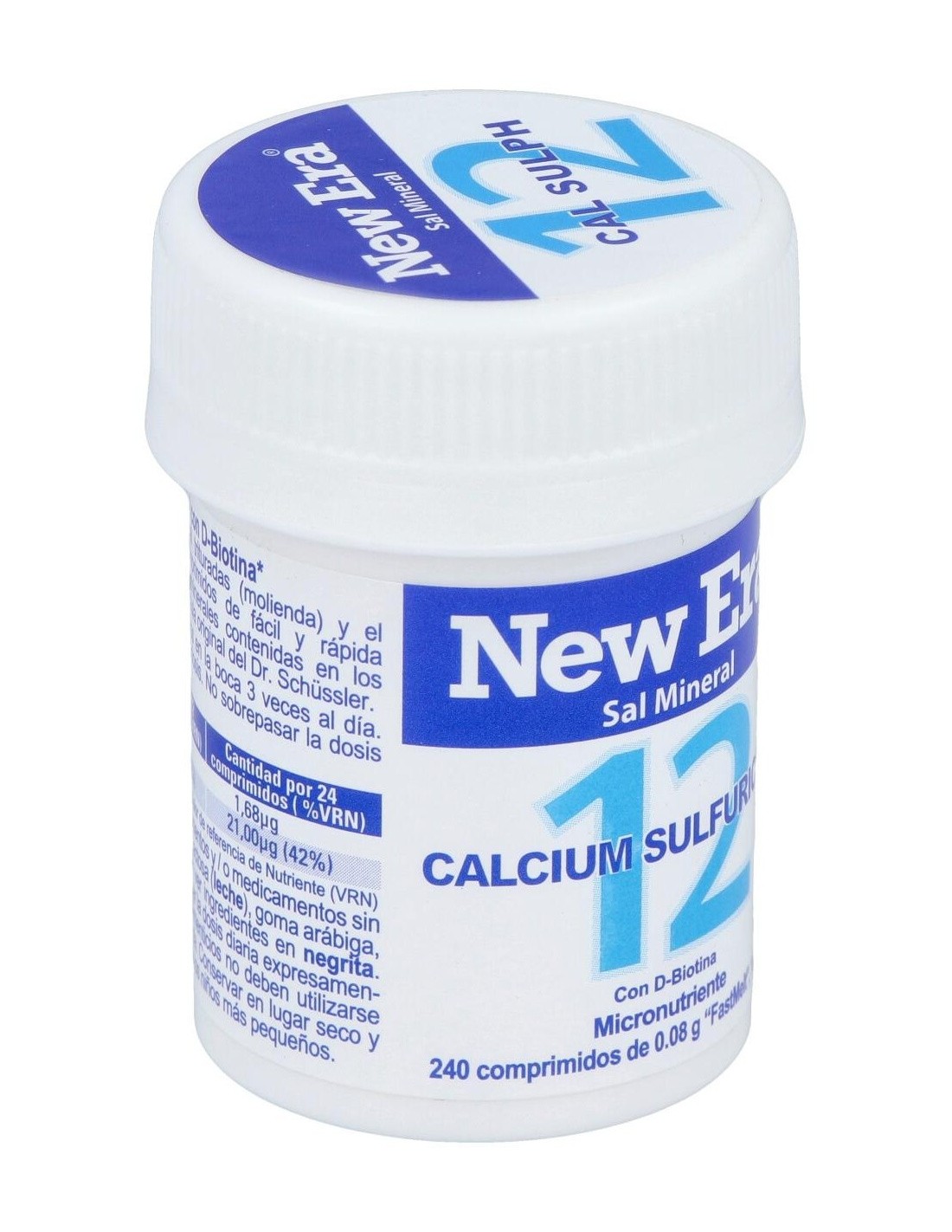Sal de Schüssler Nr.12 Calcium sulfuricum (sulfato de calcio). Contiene partículas de sal mineral trituradas (molienda) y el nutriente esencial Biotina en comprimidos de fácil y rápida disolución ('FastMelt'). Las sales minerales contenidas en los comprimidos New Era siguen la fórmula original del Dr. Schüssler. Apto para vegetarianos.