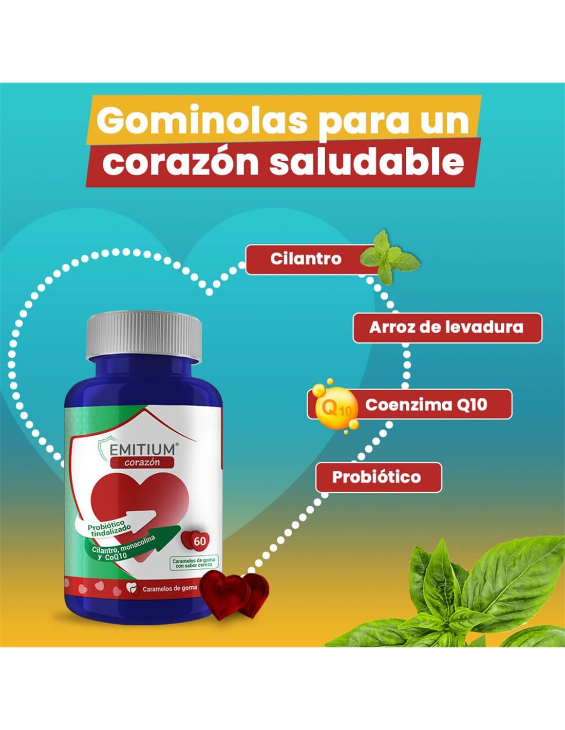NIAMEMITIUM® Corazón es un complemento alimenticio natural diseñado para ayudar a mantener unos niveles normales de colesterol ya que su formulación en formato gominola con sabor a cereza incluye ingredientes como el cilantro, el arroz de levadura roja y una cepa probiótica. El arroz de levadura roja contribuye a mantener niveles normales de colesterol en sangre. Con acción antioxidante gracias a los polifenoles presentes en el cilantro. Además, la Q10 ayuda a la producción de energía celular.