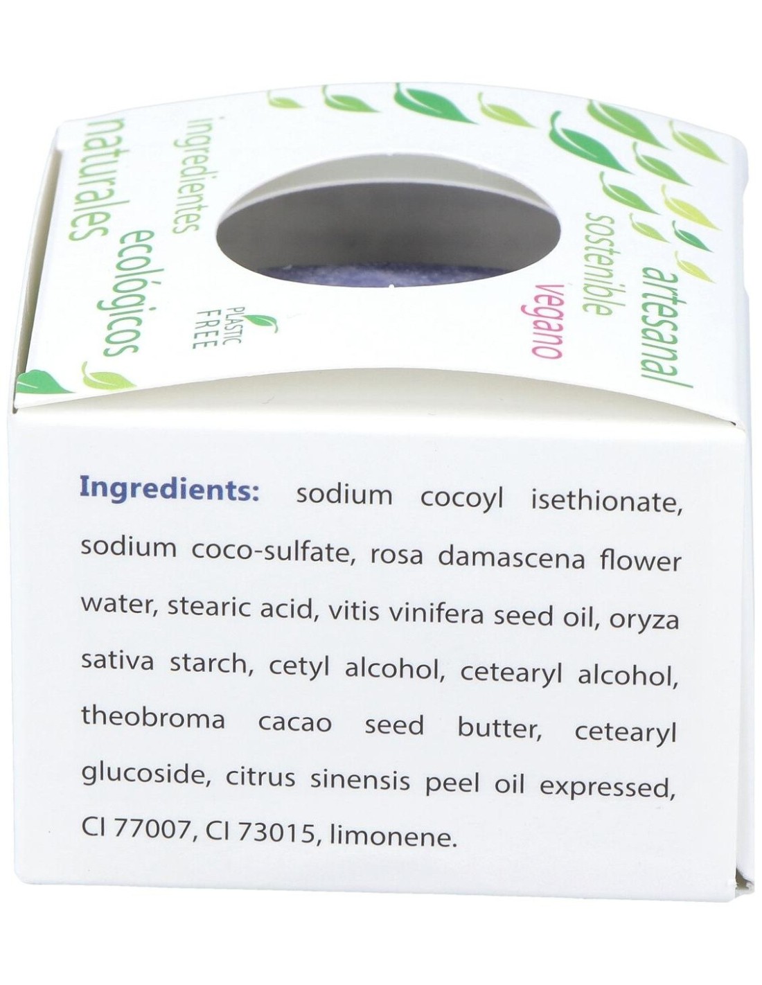 SODIUM COCOYL ISETHIONATE, SODIUM COCO-SULFATE, ROSA DAMASCENA FLOWER WATER, STEARIC ACID, VITIS VINIFERA SEED OIL, ORYZA SATIVA STARCH, CETYL ALCOHOL, CETEARYL ALCOHOL, THEOBROMA CACAO SEED BUTTER, CETEARYL GLUCOSIDE, CITRUS SINENSIS PEEL OIL EXPRESSED, CI 77007, CI 73015, LIMONENE.