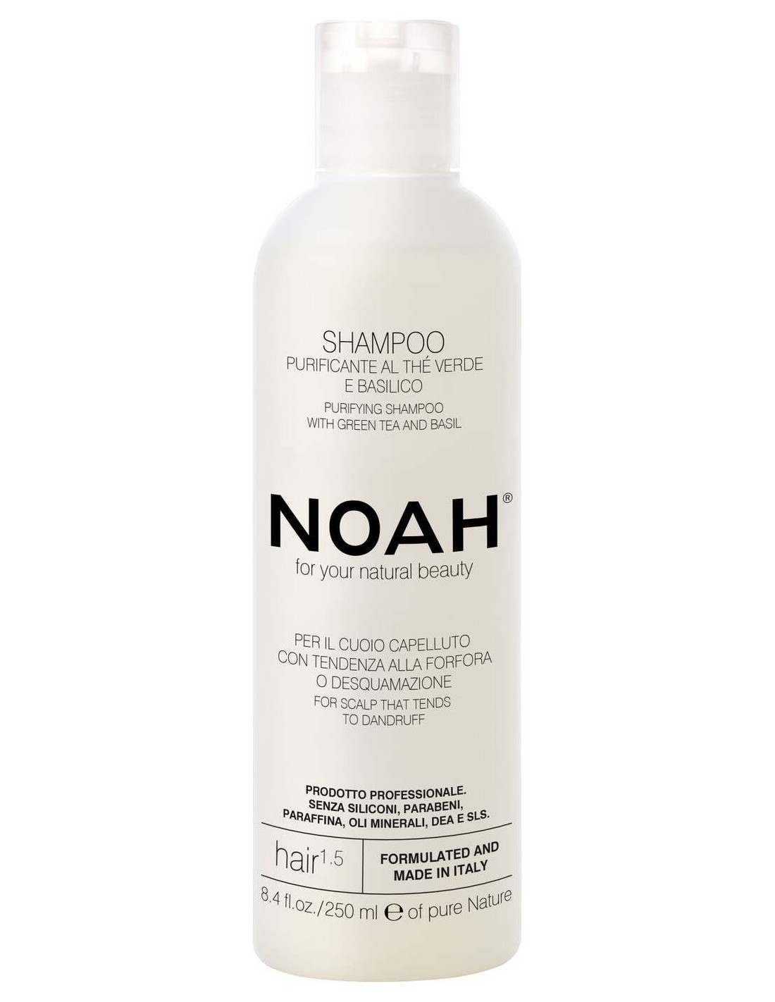 NOAHChampú purificante con acción reequilibrante para cueros cabelludos con tendencia a la caspa o descamación. Su base de lavado está compuesta por detergentes 'suaves' y respetuosos con el cabello de origen vegetal. Contiene extracto de Té Verde y Albahaca con acción antioxidante y dermopurificante, para dar vitalidad y nueva energía al cabello. Gracias a un derivado especial del ácido undecilénico, purifica el cuero cabelludo, eliminando la molesta sensación de picor. El producto NO contiene Siliconas, Parabenos, Parafina, Aceites Minerales, DEA y SLS.