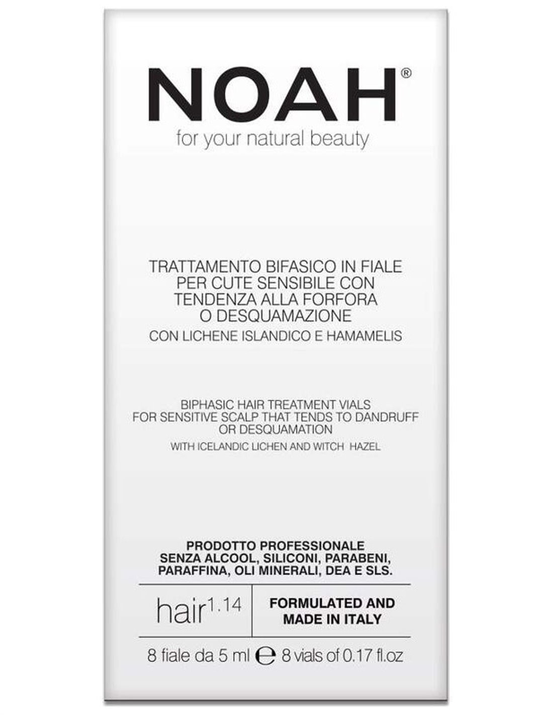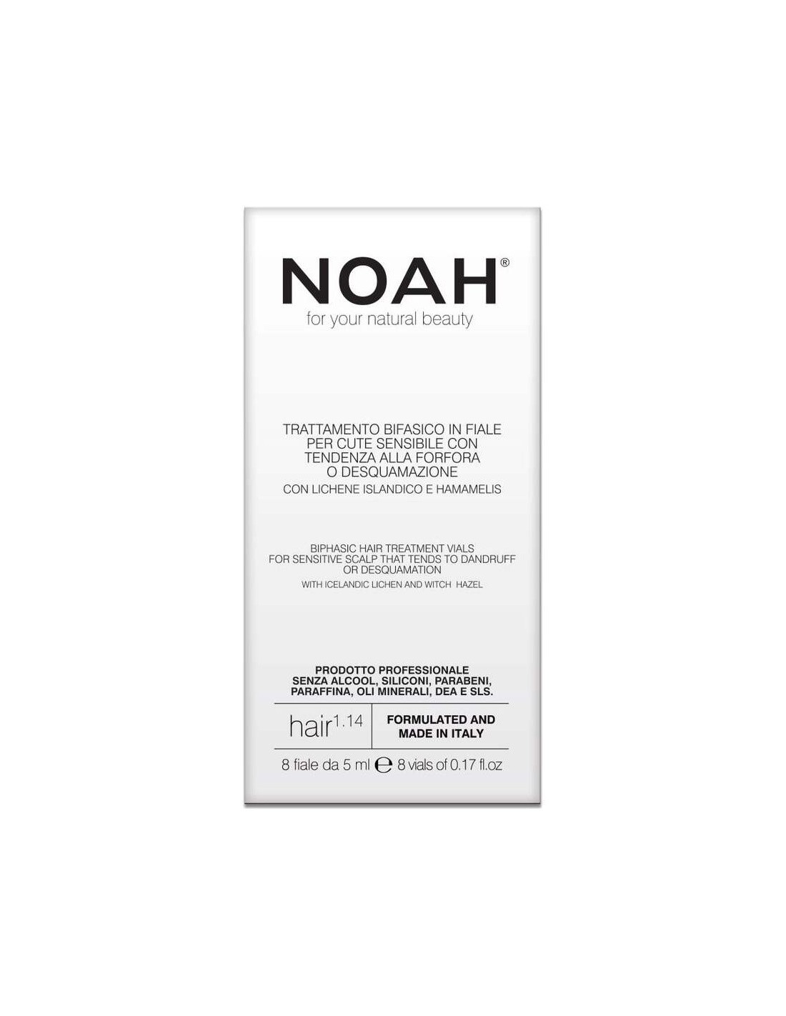 NOAHTratamiento bifásico en viales para cuero cabelludo sensible con tendencia a la caspa o descamación con extractos de plantas de liquen de Islandia y Hamamelis. Contiene una mezcla activa de aceites esenciales con actividad seborreguladora, calmante y purificante y bisabolol que tiene un efecto calmante sobre la piel enrojecida. El producto NO contiene Alcohol, Siliconas, Parabenos, Parafina, Aceites Minerales, DEA y SLS.