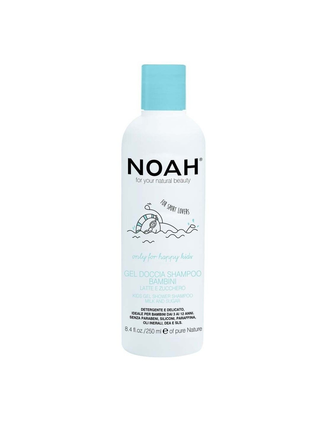 NOAHGel de ducha champú infantil, excelente después de la piscina o el gimnasio. Formulado con tensioactivos de origen vegetal, limpia perfectamente el cuero cabelludo y el cabello. El gel, enriquecido con azúcar hidratante, leche de almendras nutritiva y proteínas de arroz suavizantes, deja la piel sedosa y el cabello suave. Ideal para la higiene diaria. El producto NO contiene Siliconas, Parabenos, Parafina, Aceites Minerales, DEA y SLS.