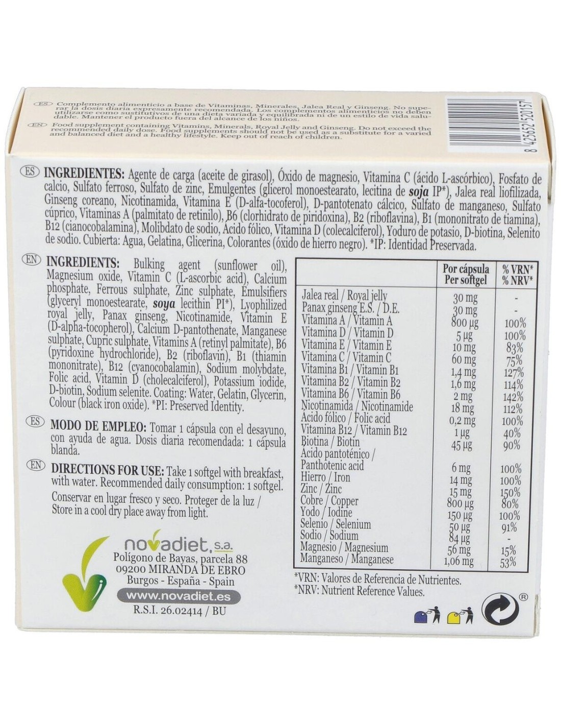 Agente de carga (aceite de girasol), Óxido de magnesio, Vitamina C (ácido L ascórbico), Fosfato de cálcio, Sulfato ferroso, Sulfato de zinc, Emulgentes (glicerol monoestearato, lecitina de soja IP*), Jalea real liofilizada, Extracto de ginseng coreano, Nicotinamida, Vitamina E (D-alfa-tocoferol), D-pantotenato cálcico, Sulfato de manganeso, Sulfato cúprico, Vitaminas A (palmitato de retinilo), B6 (clorhidrato de piridoxina), B2 (riboflavina), B1 (mononitrato de tiamina), B12 (cianocobalamina), Molibdato de sodio, Ácido fólico, Vitamina D (colecalciferol), Yoduro de potasio, D-biotina, Selenito de sodio. Cubierta: Agua, Gelatina, Glicerina, Colorantes (óxido de hierro negro, dióxido de titanio, Patent blue).