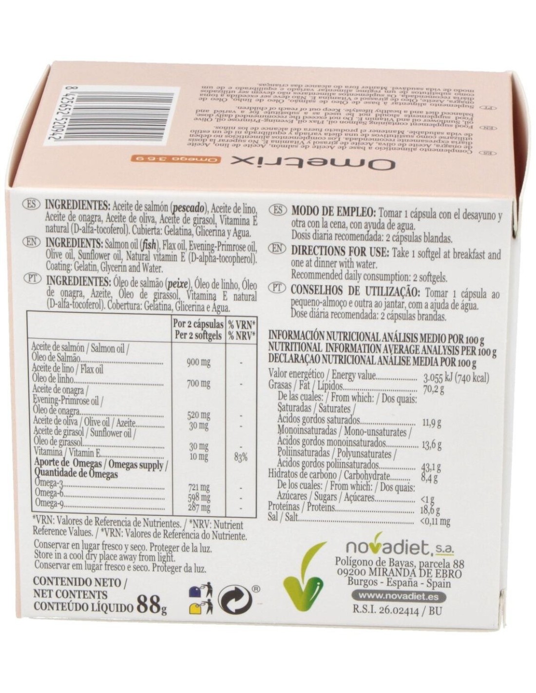 POR CÁPSULA: * ACEITE DE SALMÓN (450 MG) * ACEITE DE LINO (350 MG) * ACEITE DE ONAGRA (260 MG) * ACEITE DE OLIVA (15 MG) * ACEITE DE GIRASOL (15 MG) * VITAMINA E NATURAL (5 MG).