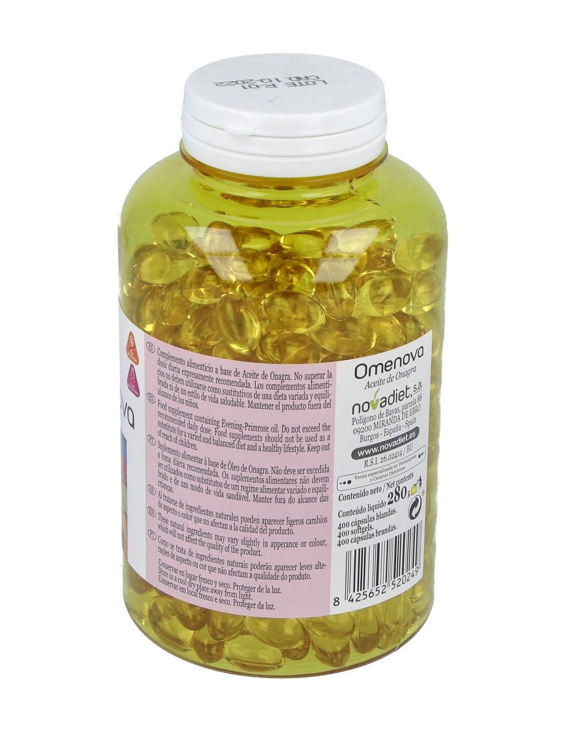 Aceite de Onagra de primera presión en frío, Antioxidante (vitamina E: D-alfa-tocoferol). Cubierta: Gelatina, Glicerina y Agua.