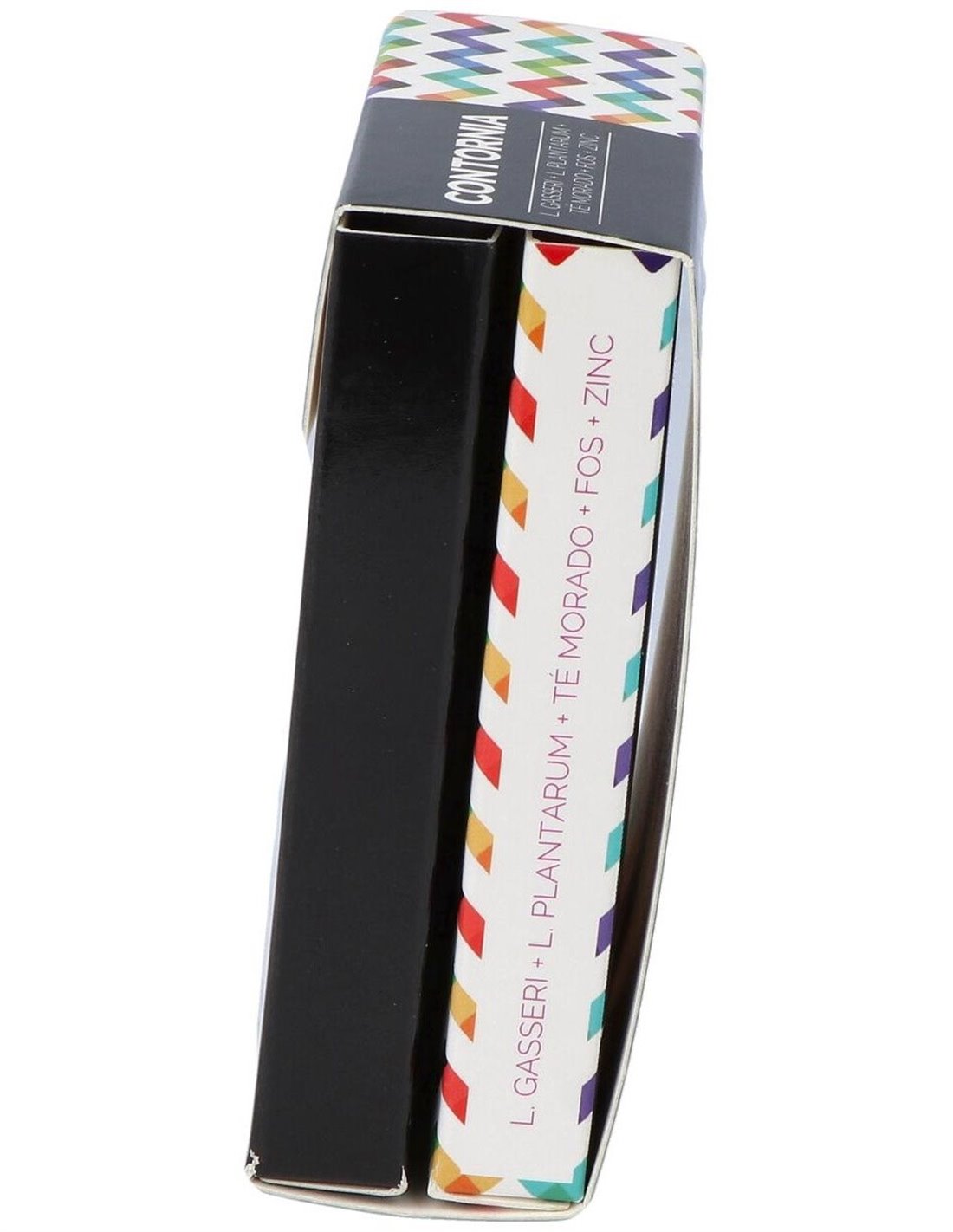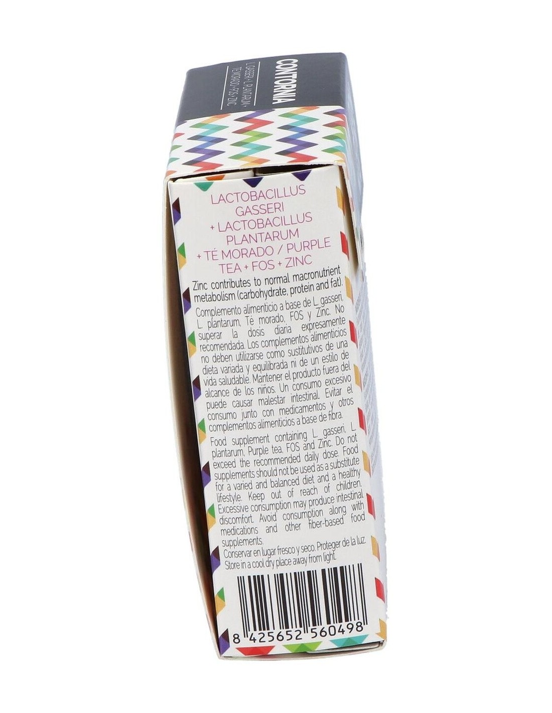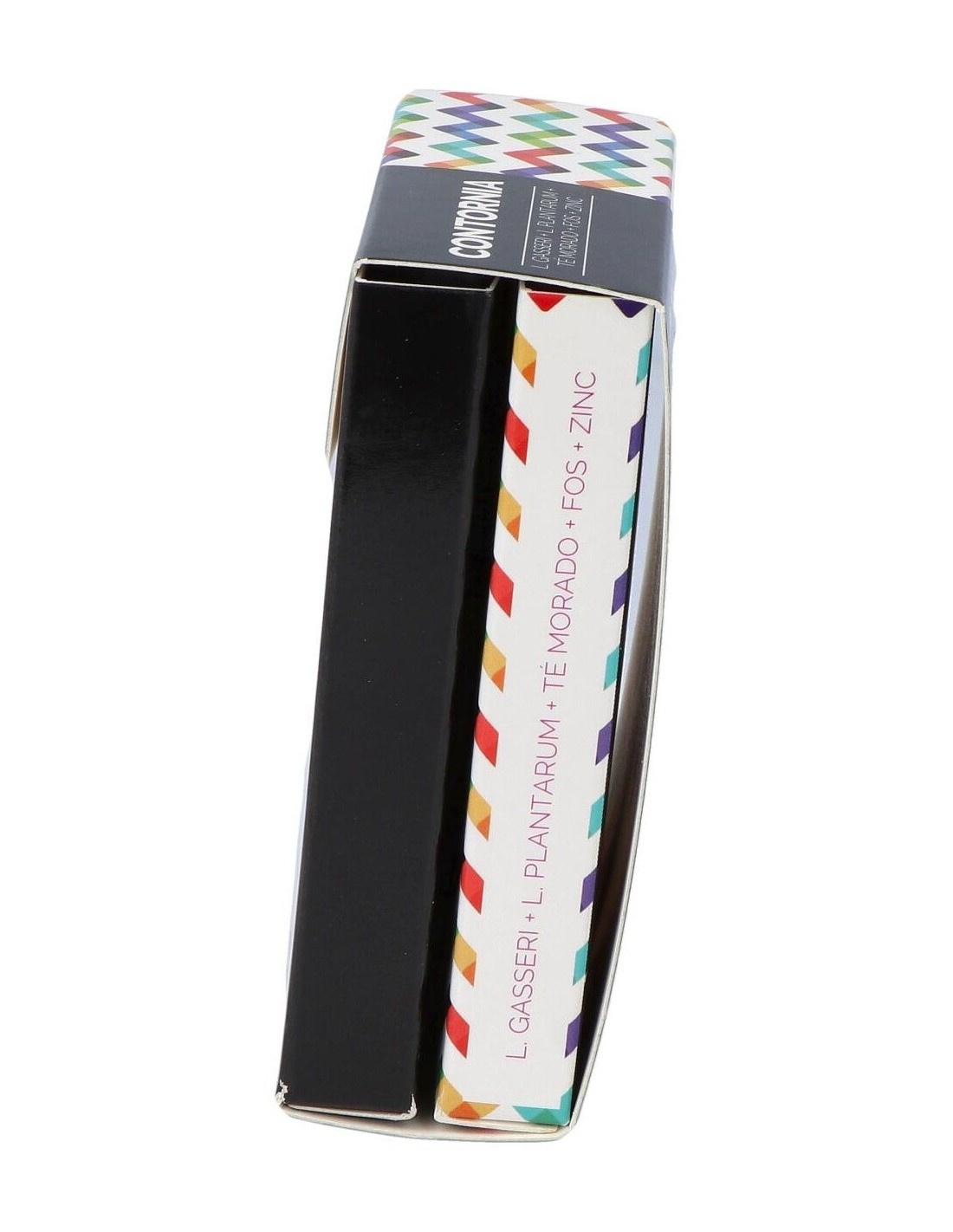 Té morado (E.S. titulado al 3% en GHG), Fructooligosacáridos (FOS), Lactobacillus gasseri, Agente de carga (celulosa microcristalina), Lactobacillus plantarum, Antiaglomerantes (estearato de magnesio, dióxido de silicio), Sulfato de zinc. Cubierta: Agua, Hidroxipropilmetilcelulosa, Colorante (dióxido de titanio). *GHG: 1,2-digaloil-4,6-hexahidroxitrifenileno-D-glucosa.