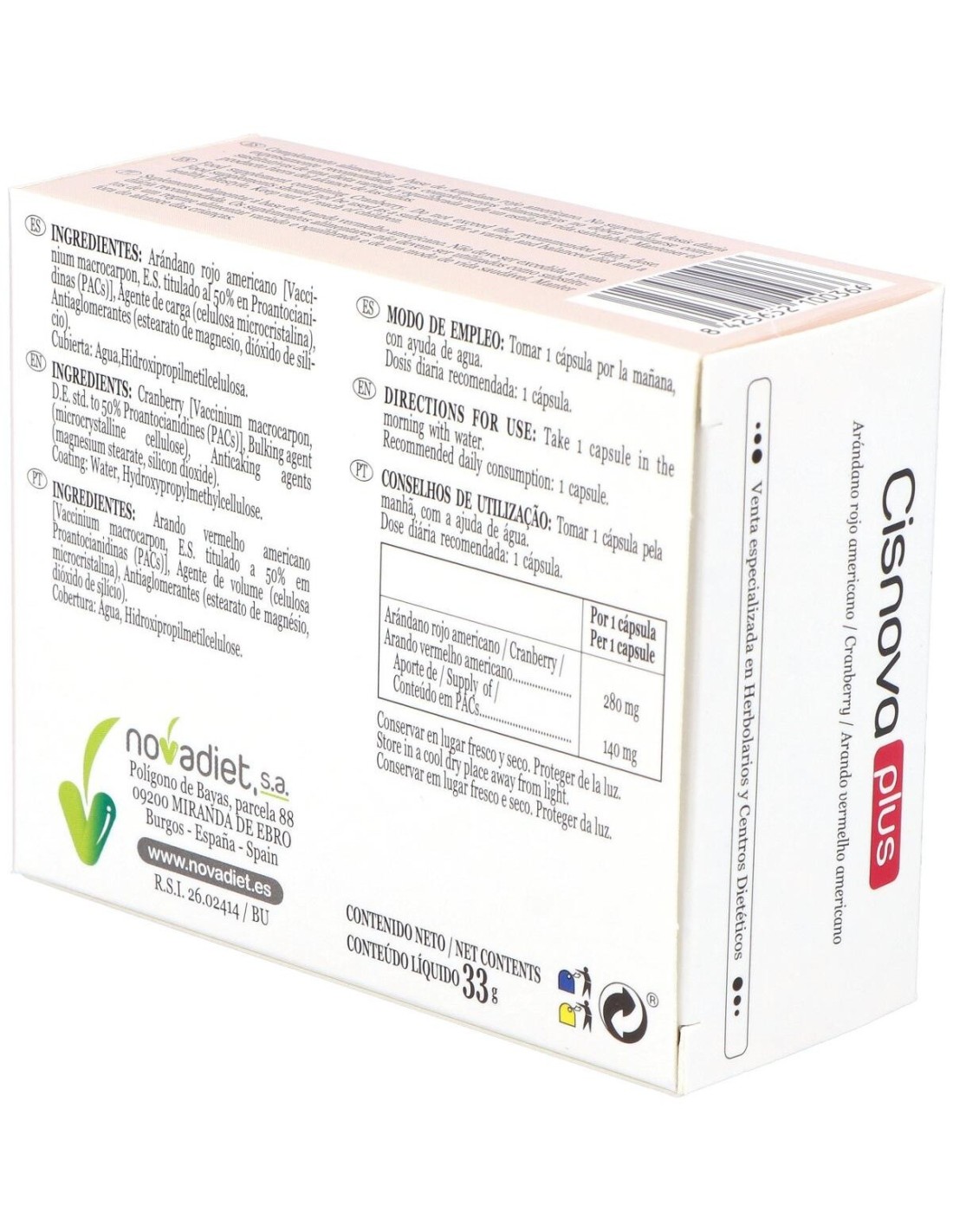 Arándano rojo americano [Vaccinium macrocarpon, E.S. titulado al 50% en Proantocianidinas (PACs)], Agente de carga (celulosa microcristalina), Antiaglomerantes (estearato de magnesio, dióxido de silicio). Cubierta: Agua, Hidroxipropilmetilcelulosa.