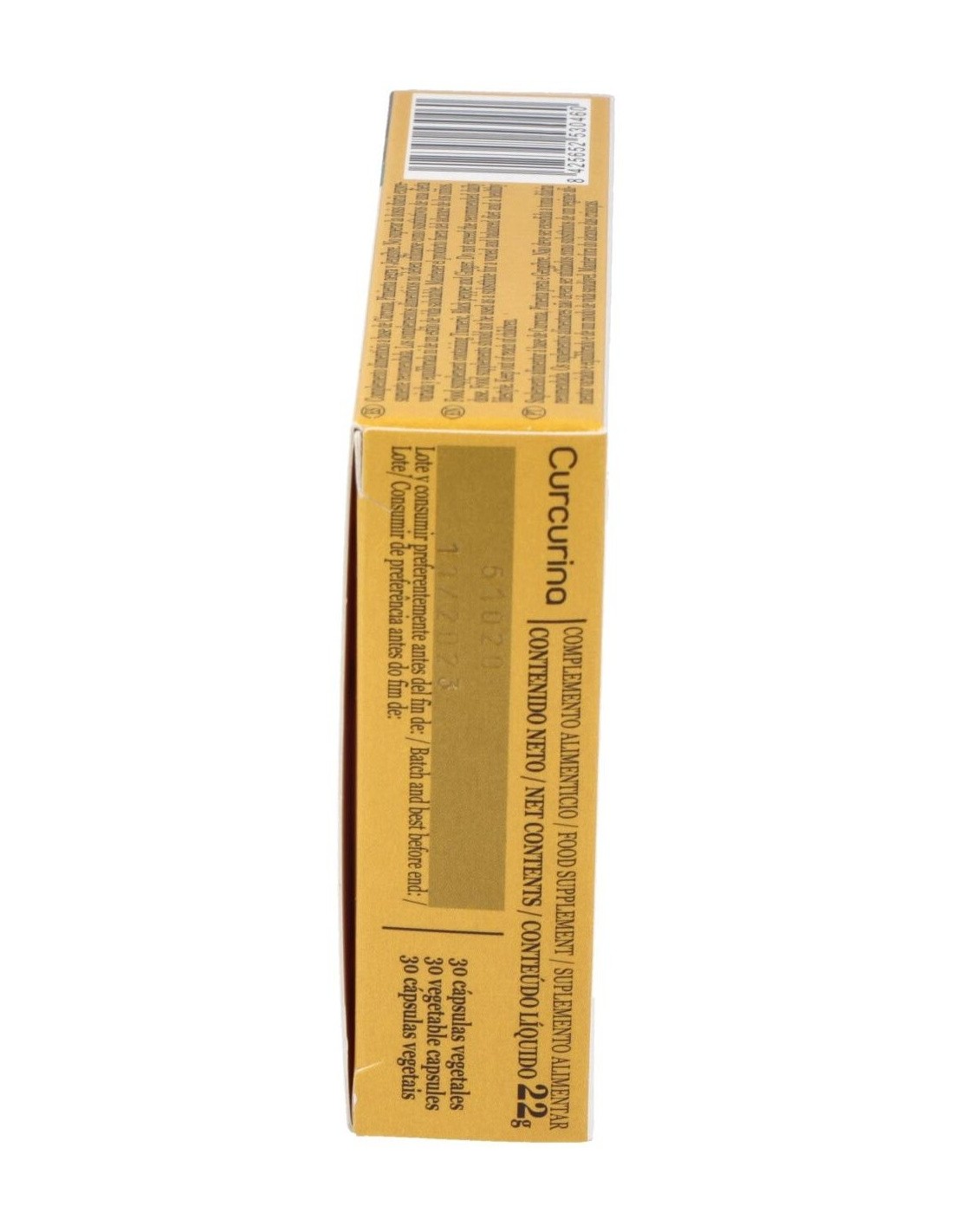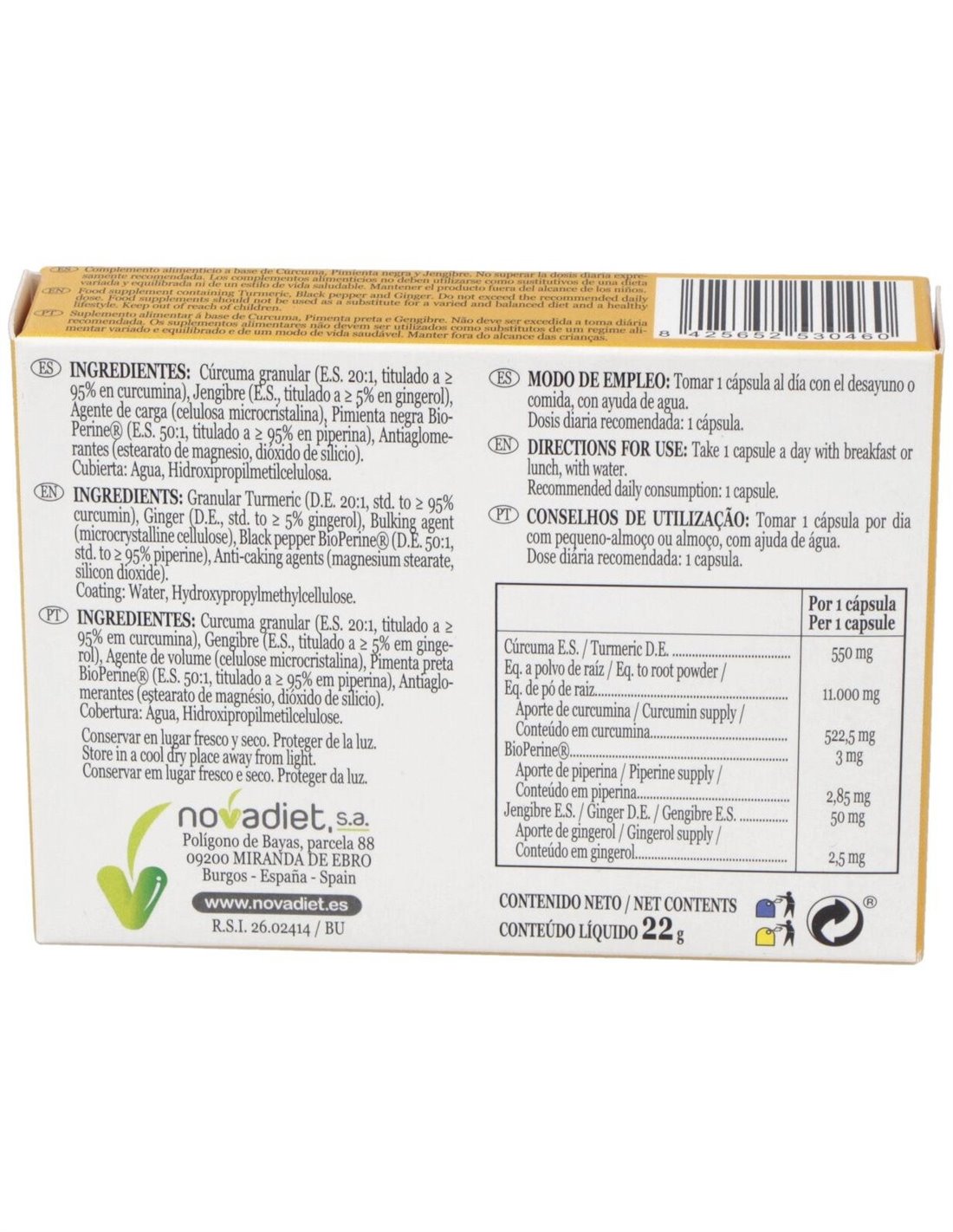 Cúrcuma granular (E.S. 20:1, titulado a = 95% en curcumina), Jengibre (E.S., titulado a = 5% en gingerol), Agente de carga (celulosa microcristalina), Pimienta negra Bioperine® (E.S. 50:1, titulado a = 95% en piperina), Antiaglomerantes (estearato de magnesio, dióxido de silicio). Cubierta: Agua, Hidroxipropilmetilcelulosa.