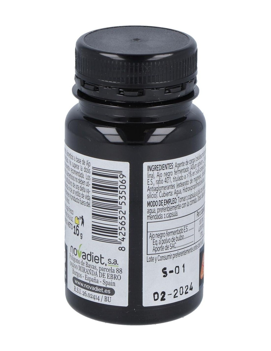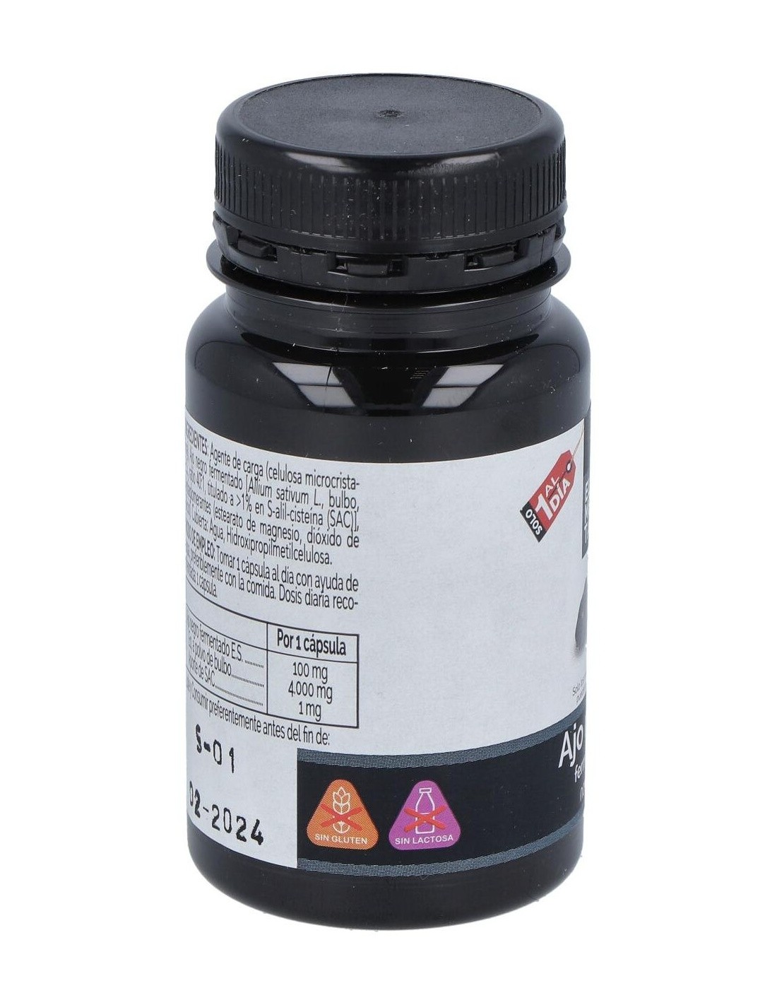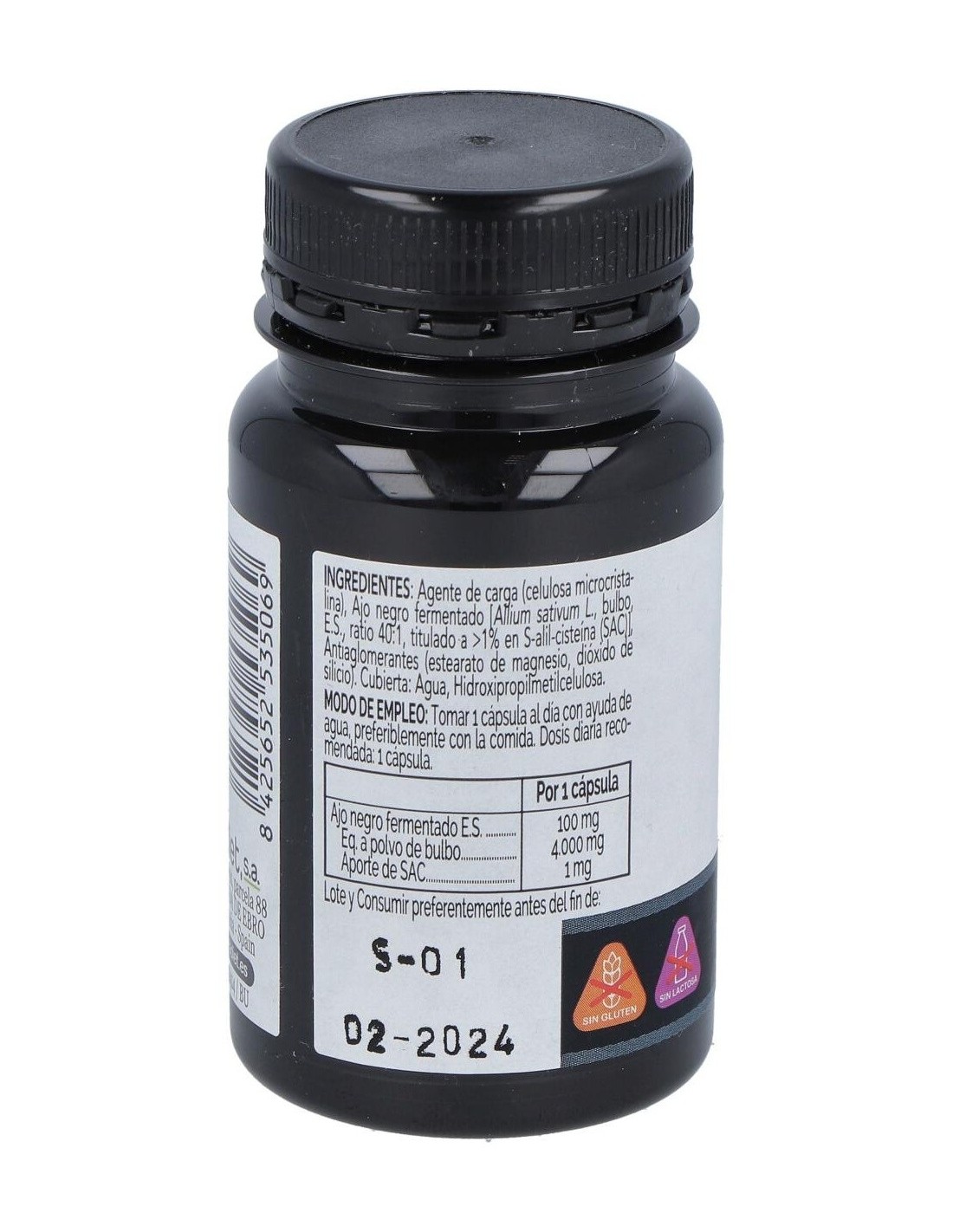 Agente de carga (celulosa microcristalina), Ajo negro fermentado [Allium sativum L, bulbo, E.S., ratio 40:1, titulado a >1% en S-alil-cisteína, (SAC)], Antiaglomerantes (estearato de magnesio, dióxido de silicio). Cubierta: Agua, Hidroxipropilmetilcelulosa.