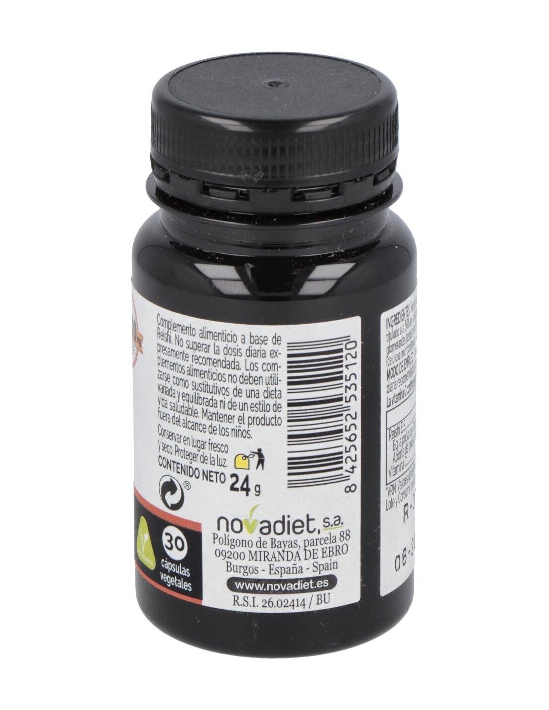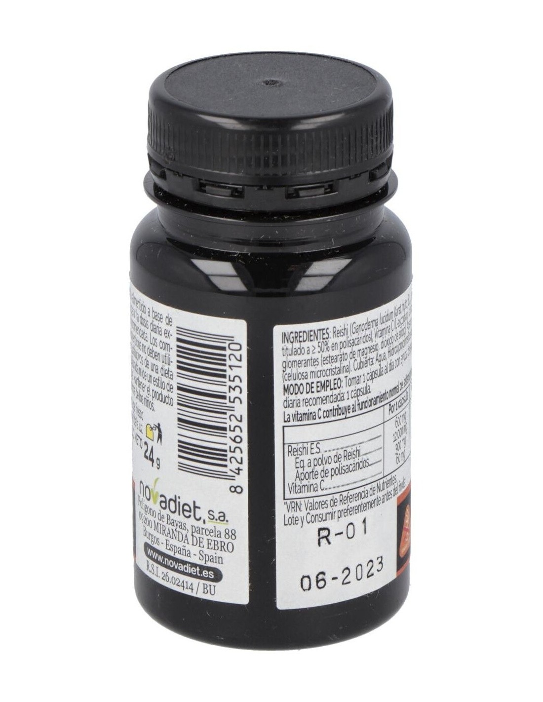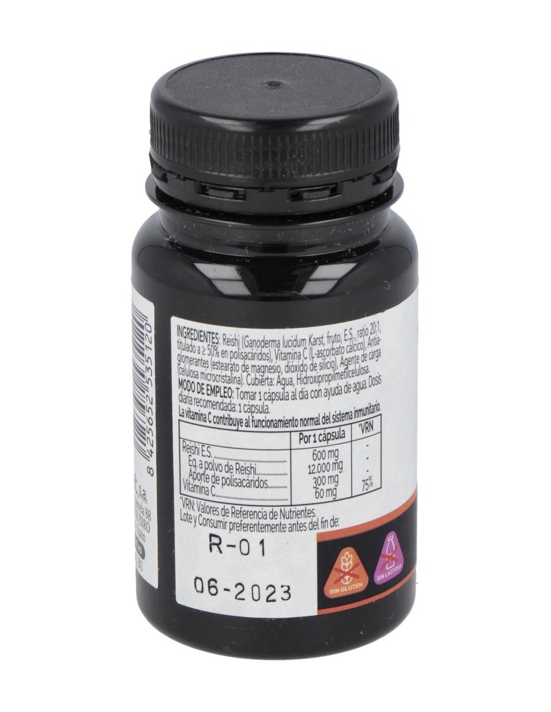 Reishi (Ganoderma lucidum Karst, fruto, E.S., ratio 20:1, titulado a = 50% en polisacáridos), Vitamina C (L-ascorbato cálcico), Antiaglomerantes (estearato de magnesio, dióxido de silicio), Agente de carga (celulosa microcristalina). Cubierta: Agua, Hidroxipropilmetilcelulosa.