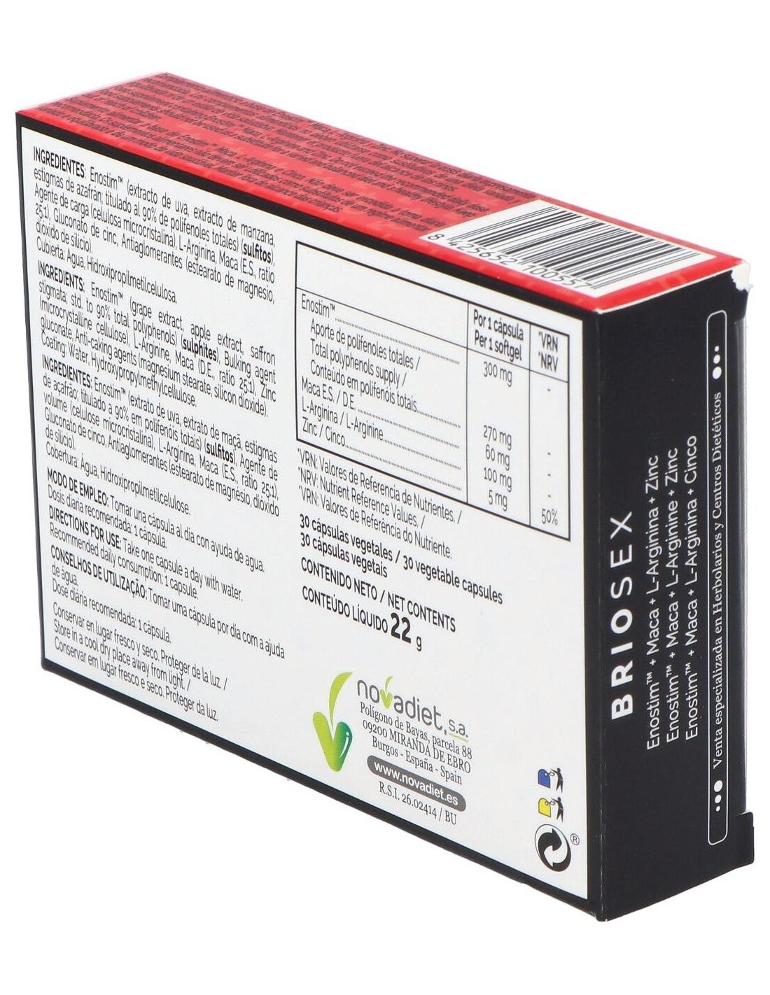 EnoSTIM (extracto de uva, extracto de manzana, estigmas de azafrán: titulado al 90% de polifenoles totales), celulosa microcristalina, L-arginina, maca (E.S. ratio 25:1), gluconato de zinc, estearato de magnesio, dióxido de silicio, agua, hidroxipropilmetilcelulosa.