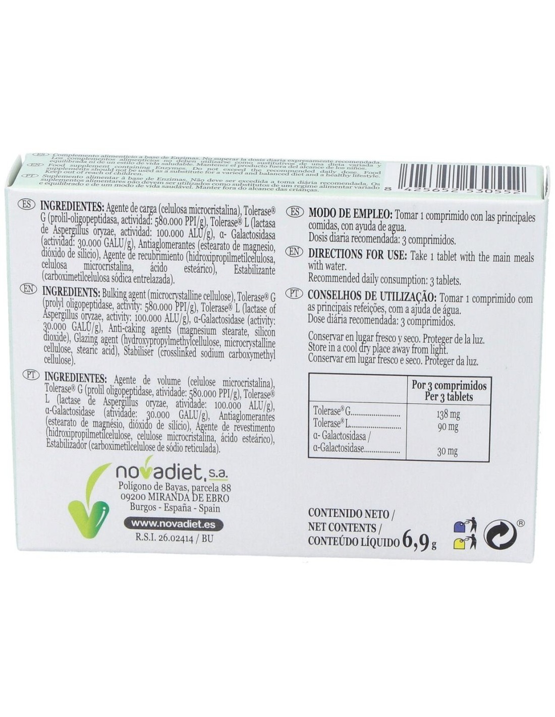 Celulosa microcristalina, Tolerase G (prolil-oligopeptidasa, actividad: 580.000 PPI/g), Tolerase L (lactasa de aspergillus oryzae, actividad: 1000 ALU/g), galactosidasa (actividad: 30.000 GALU/g), estearato de magnesio, dióxido de silicio, hidroxipropilmetilcelulosa, celulosa microcristalina, ácido esteárico, carboximetilcelulosa sódica entrelazada.