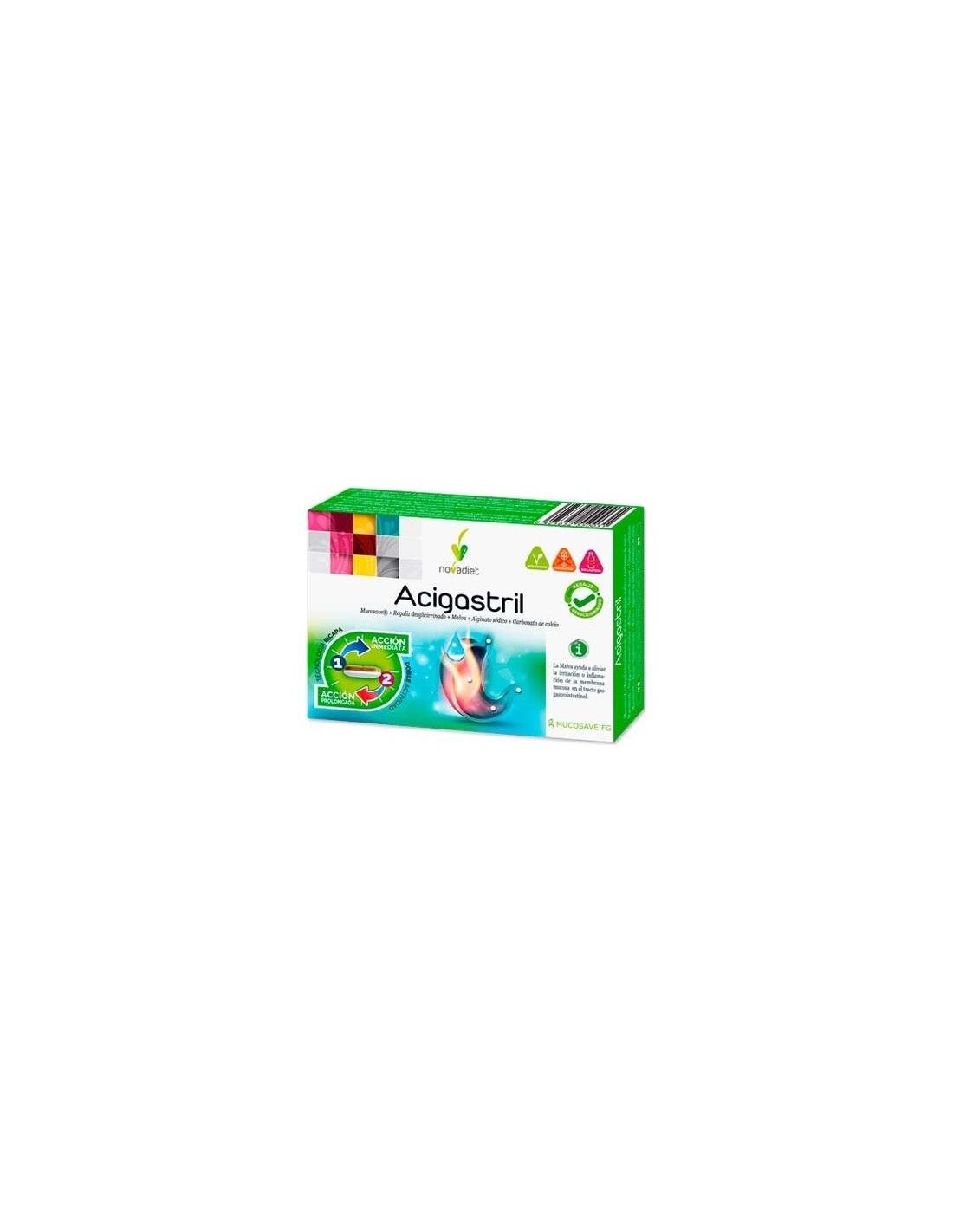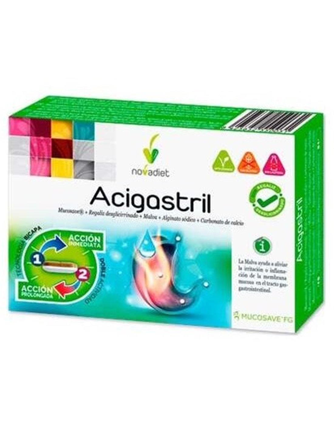 NOVADIETComplemento alimenticio de apoyo al bienestar gástrico, en una fórmula completa y eficaz gracias a su tecnología bicapa:\ La capa blanca aporta Alginato sódico y Carbonato de calcio, dos ingredientes que ayudan de forma rápida en caso de acidez y reflujo tras las comidas.\ La capa marrón contiene Mucosave®, Regaliz desglicirrinado y Malva, ingredientes que ayudan a proteger la mucosa del estómago y apoyan el bienestar gástrico de forma más prolongada en el tiempo.
