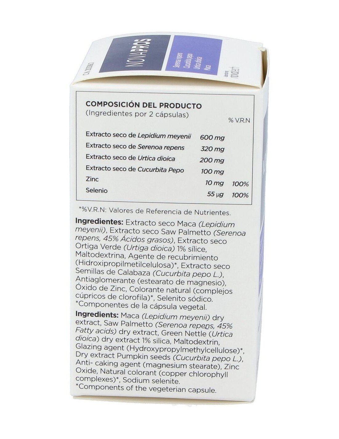 Extracto seco maca, extracto seco saw palmetto (45% ácidos grasos), extracto seco ortiga verde (1% silice), maltodextrina, hidroxipropilmetilcelulosa, extracto seco semillas de calabaza, estearato de magnesio, óxido de zinc, colorante natural (complejos cúpricos de clorofila), selenito sódico.