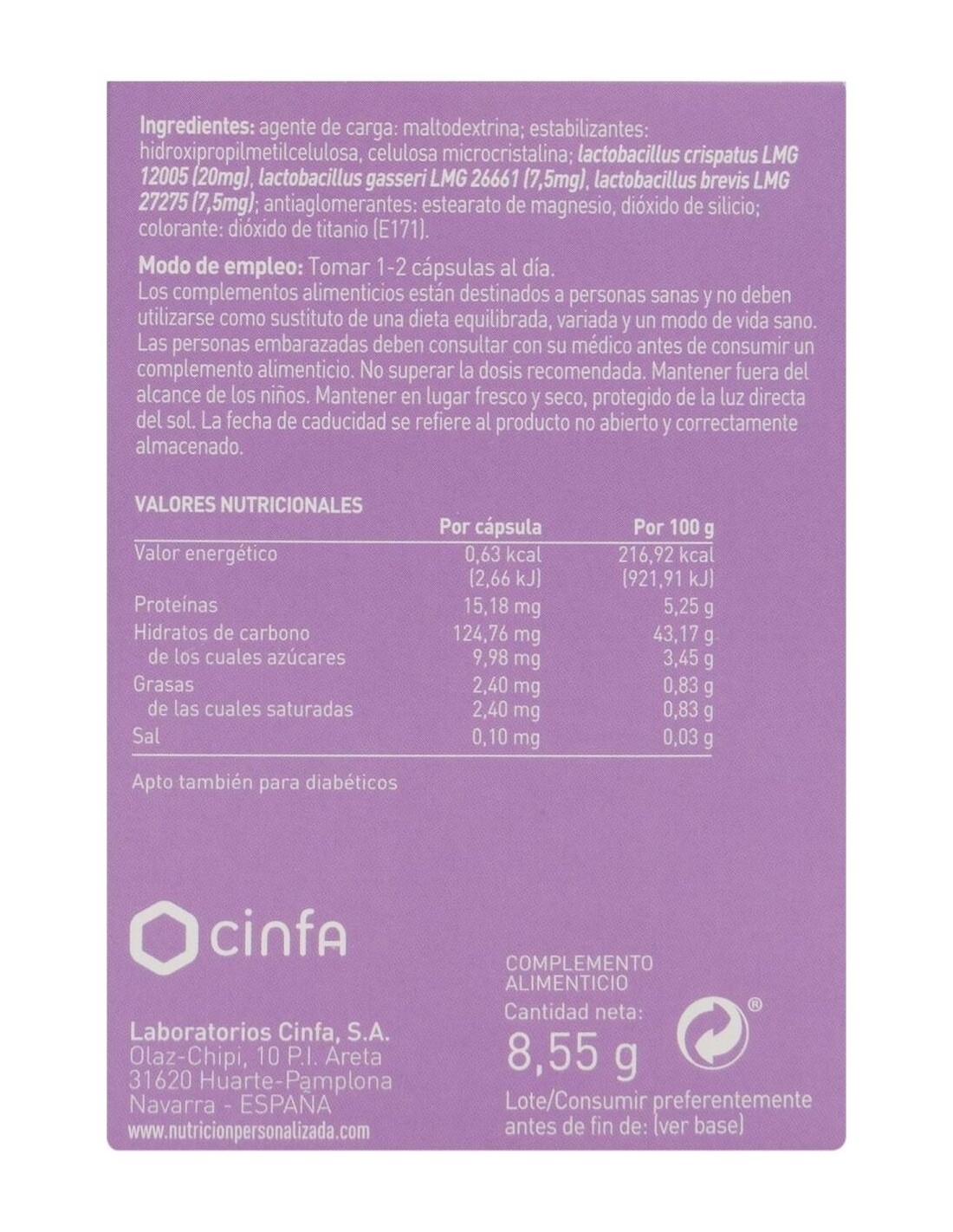 Agente de carga (maltodextrina), estabilizantes (hidroxipropilmetilcelulosa, celulosa microcristalina), Lactobacillus crispatus LMG 12005 (20 mg), Lactobacillus gasseri LMG 26661 (7,5 mg), Lactobacillus brevis LMG 27275 (7,5 mg), antiaglomerantes (estearato de magnesio, dióxido de silicio), colorante (dióxido de titanio E171).