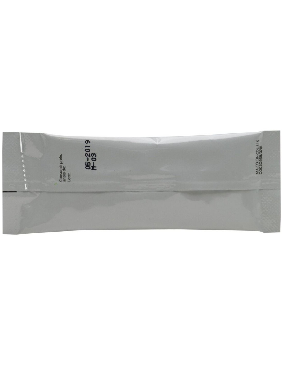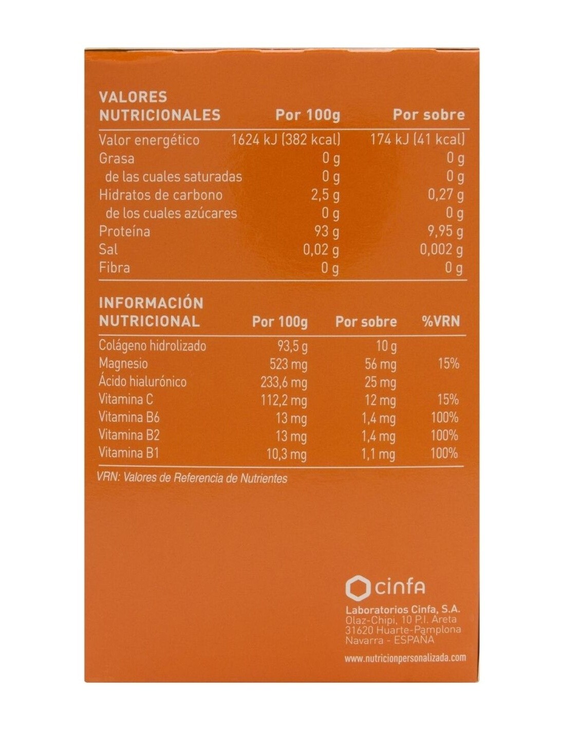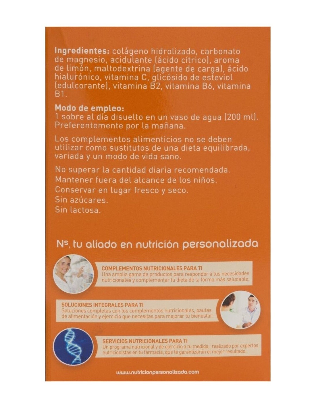 Colágeno hidrolizado, carbonato de magnesio, acidulante (ácido cítrico), aroma de limón, maltodrextrina, vitamina C, ácido hialurónico, glicósido de esteviol, vitamina B2, vitamina B6, vitamina B1. Por sobre: Colágeno hidrolizado: 10 g Magnesio: 56 mg Ácido hialurónico: 25 mg Vitamina C: 12 mg Vitamina B1: 1,1 mg Vitamina B2: 1,4 mg Vitamina B6: 1,4 mg