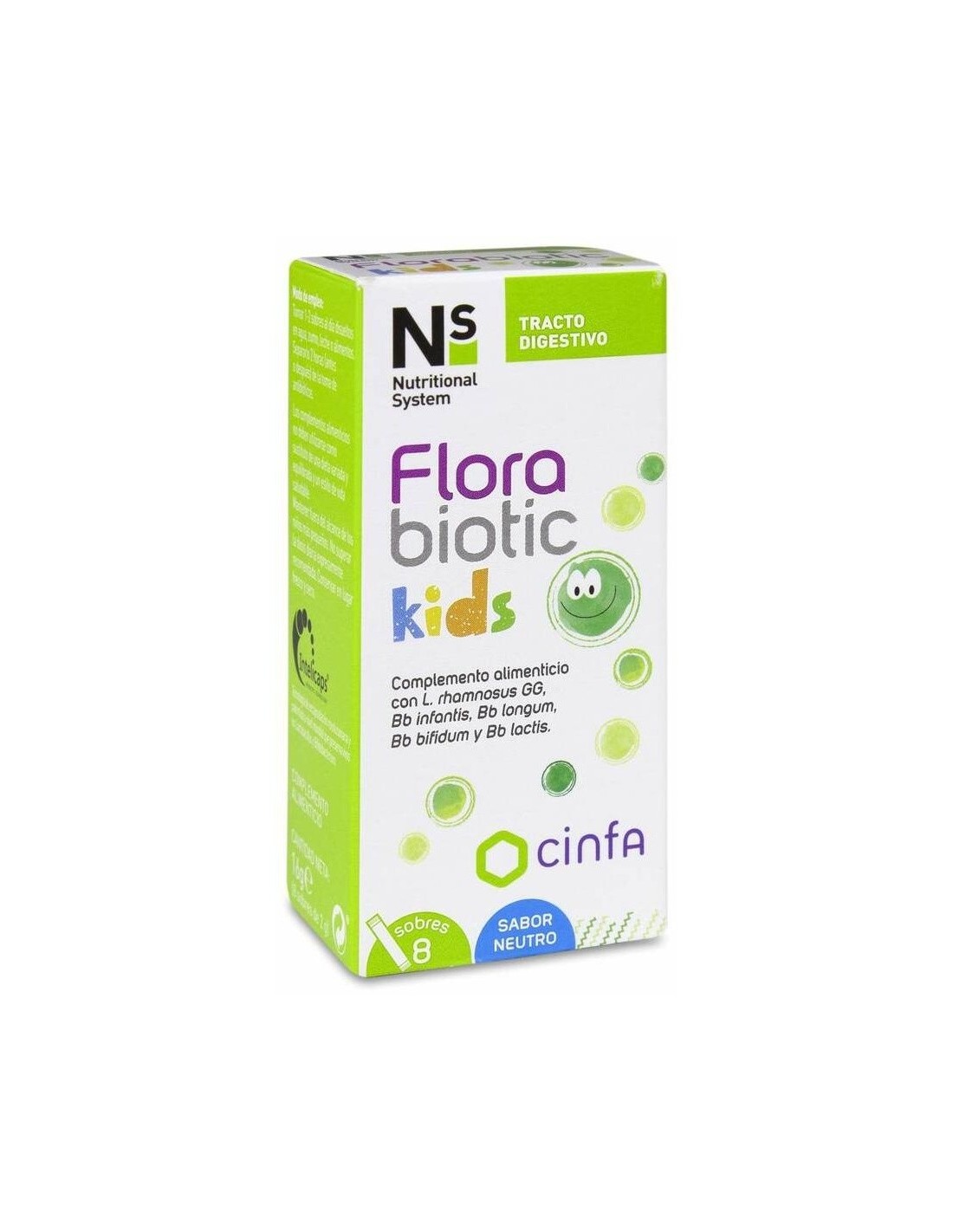 Cinfa Ns Florabiotic Kids 8 Sobres es un complemento alimenticio que contiene Lactobacillus rhamnosus GGy una combinación de cepas de Bifidobacterium.