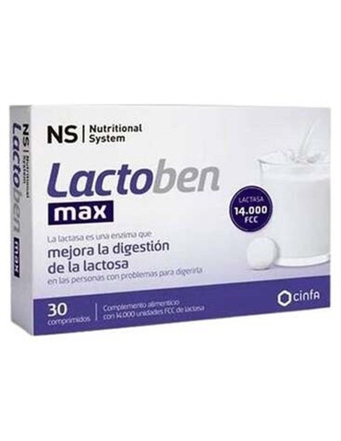 NSLactoben Max de Ns Cinfa permite a los intolerantes a la lactosa comer alimentos con lactosa sin sufrir las molestias intestinales y gases que normalmente les provoca la lactosa. Gracias al alto contenido en enzima lactasa ( 14.00 FCC por dosis) un comprimido digiere 500 ml de leche. siendo útil para aquellas personas con altos niveles de intolerancia a la lactosa tras la ingesta de alimentos que la contengan.
