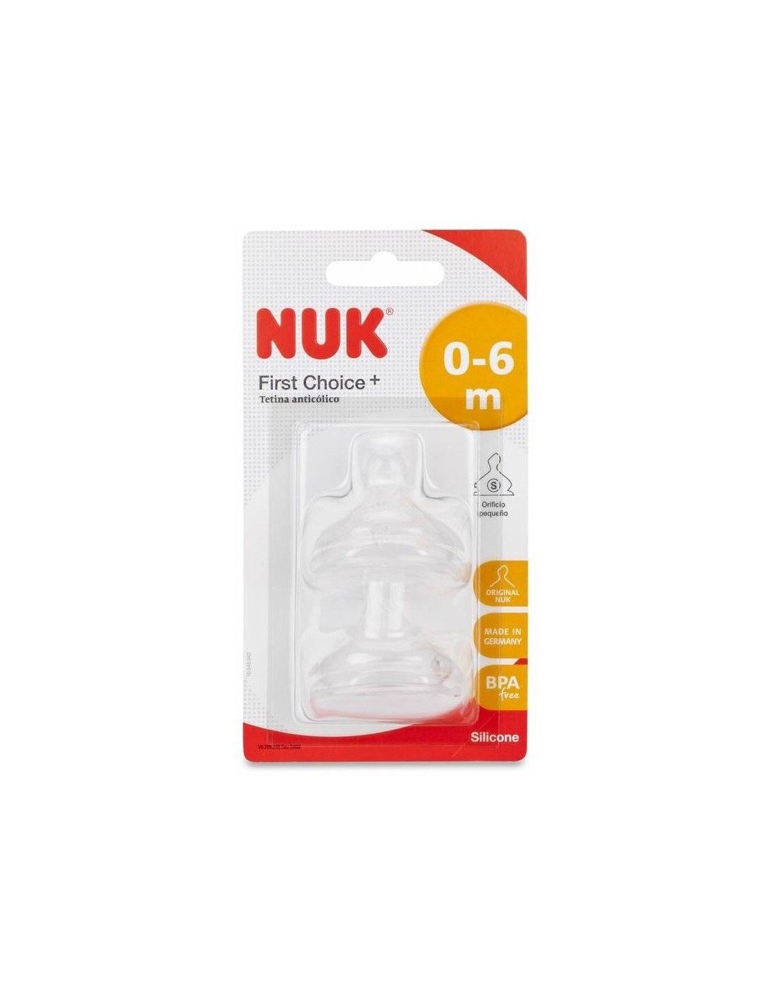 Tetina de Silicona con forma anatómica exclusiva que se adapta perfectamente a la mandíbula del bebé, de 0-6 meses. S (orificio pequeño = agua). Con sistema de ventilación NUK AIR SYSTEM mejorado que ayuda a prevenir los cólicos.
