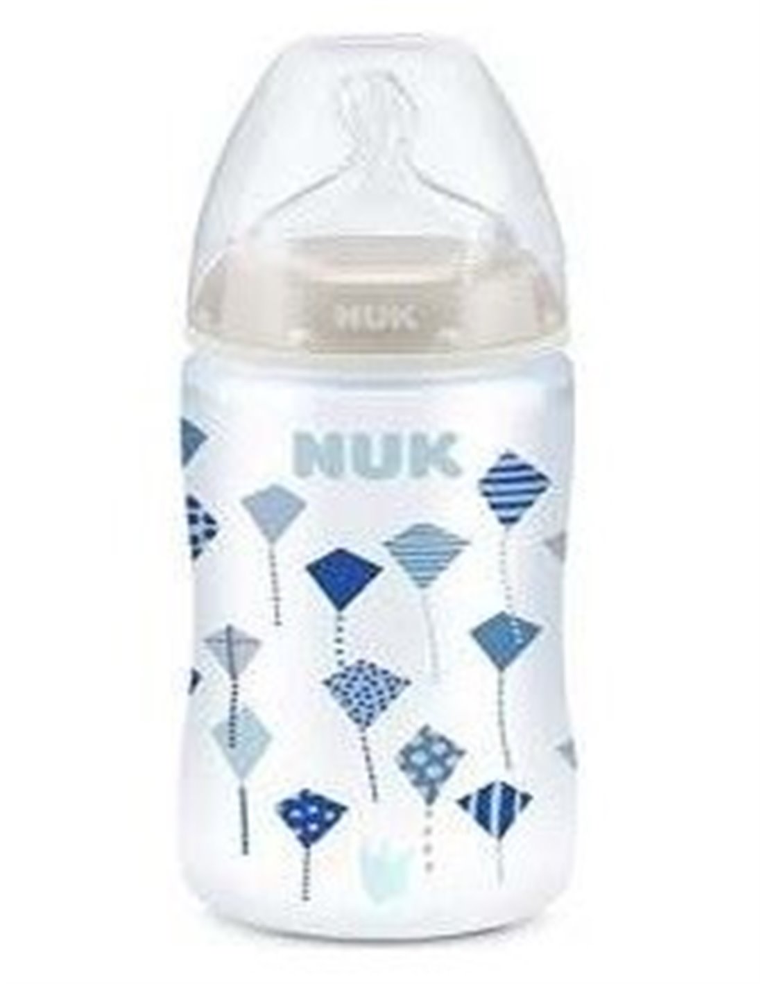 NUKGracias al Sistema Profesional de Ventilación, se reduce la cantidad de aire que llega a la barriguita del bebé durante la toma del biberón. El 90% de los expertos confirman la disminución de burbujas de aire en la leche.\ Con indicador de Control de Temperatura en la escala de medición. El color cambia con la temperatura del contenido del biberón. Si el alimento está demasiado caliente, el indicador pasa de azul a blanco.\ Tetina de suave silicona con forma natural y anatómica exclusiva que se adapta perfectamente a la mandíbula del bebé (0-6 meses, M orificio = leche).\ Fabricado con polipropileno de alta calidad (PP), sin BPA, capacidad de 300 ml.
