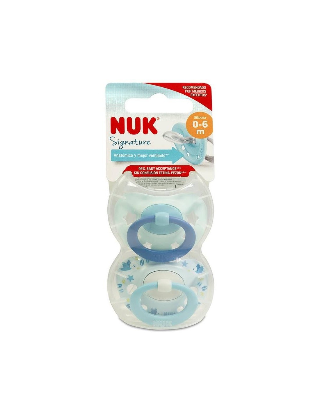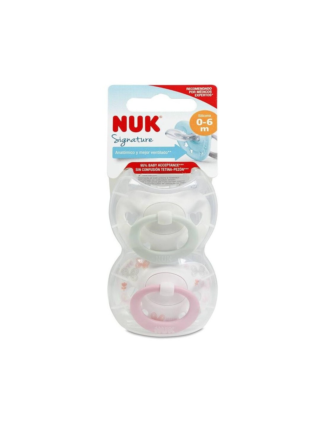 Tetina de silicona con forma anatómica exclusiva que imita el pezón de la madre durante la lactancia y que se adapta perfectamente al paladar del bebé.\ Con sistema de ventilación NUK AIR SYSTEM. El aire escapa a través de la tetina, lo que permite que ésta permanezca suave y moldeable y además previene la deformación de la mandíbula del bebé.\ Escudo que cubre la boca con forma ergonómica y con orificios de respiración con formas que permiten la circulación del aire para que la piel respire evitando la irritación.\ Nueva anilla más similar al diseño original de NUK\ Caja portachupetes higienizable de 2 uds\ Los modelos y colores pueden variar con respecto a la imagen.