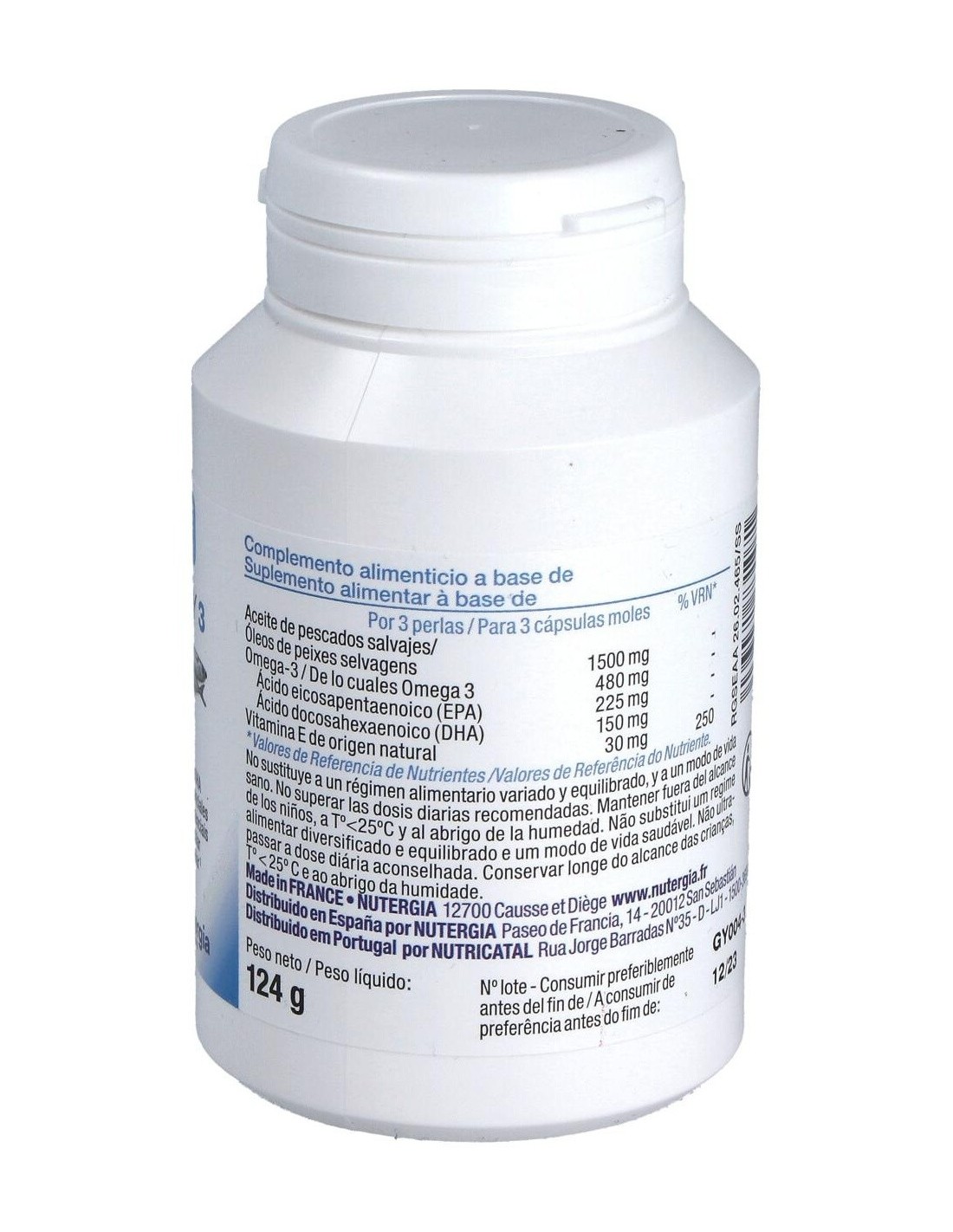 Aceite de pescados* salvajes EPAX®, vitamina E de origen natural. Perla: Gelatina de pescado, glicerol.
